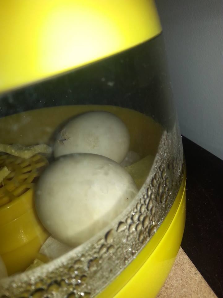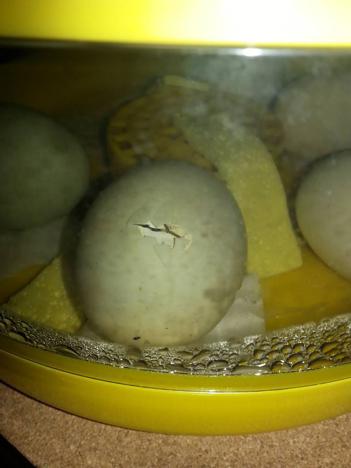 Egg 1: Pipped the right end - 26 hrs ago. Not much action. Occasionally rocks.