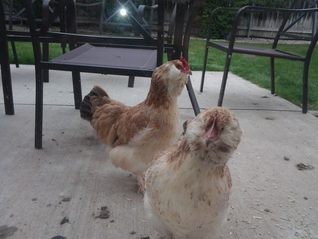 Butterscotch is a fancypants Faverolle. She is 23 weeks old this week, and her sister Luna isn't even pinking up in the face, so she's obviously not going to be laying anytime soon. Here are the two troublemakers below, don't mind Luna's dirty beard. Butterscotch is in the back: