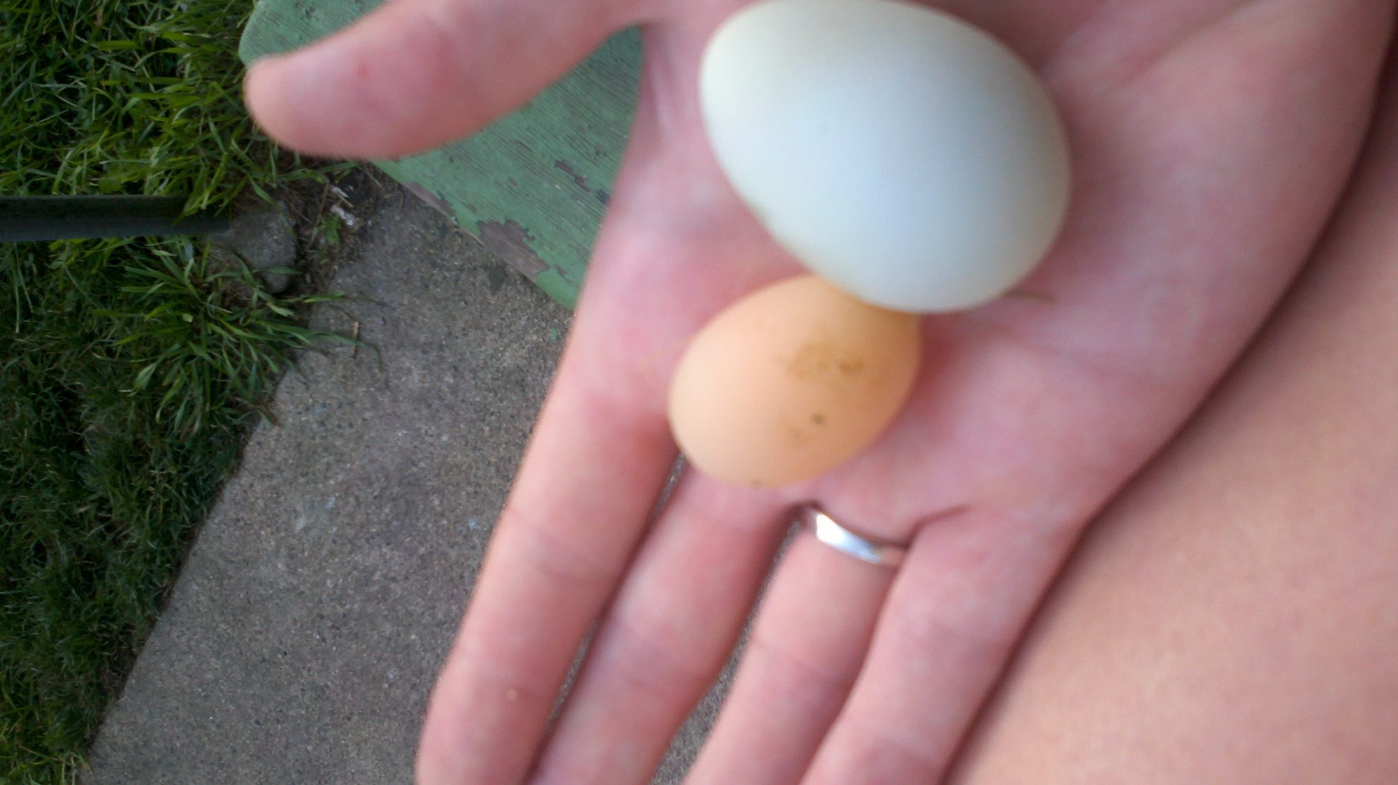 One pretty blue egg - so I guess two girls are laying now. And one really gross feeling soft shelled egg