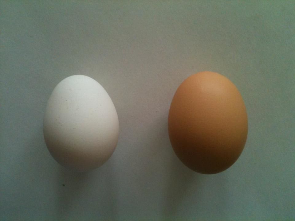 Here it is compared to one of the eggs I've been getting from our CSA (on the right). Maybe it is from our Leghorn.
