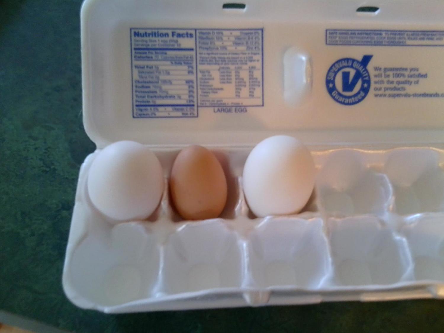 Here is the inaugural egg next to two store-bought eggs.