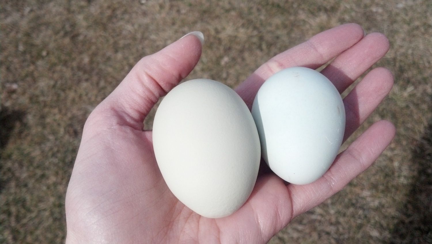 First egg from my Ameracauna - at 48 weeks old! Figured I should post here, too. :) The one on the right is hers, the one on the left is my EE's egg for size comparison.