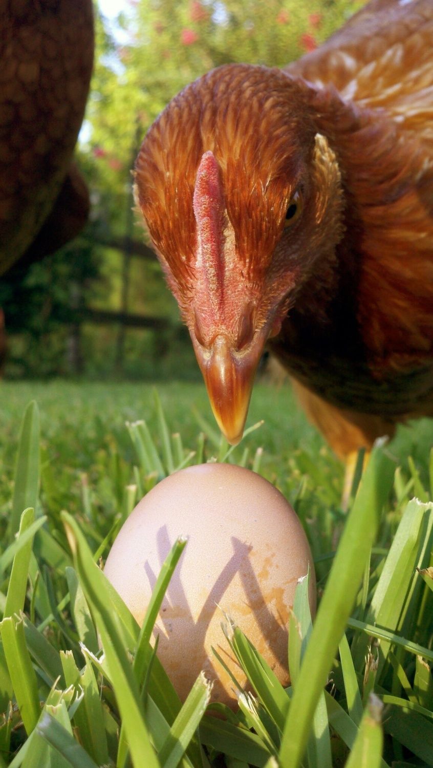 Congrats on the egg, and love the picture. Better watch it tho, if she pecks it and eats anything, it's over. She'll be after all the eggs from then on and you won't get any. Once a chicken eats a fresh egg/shell like that, they hunt them out because they are delicious!