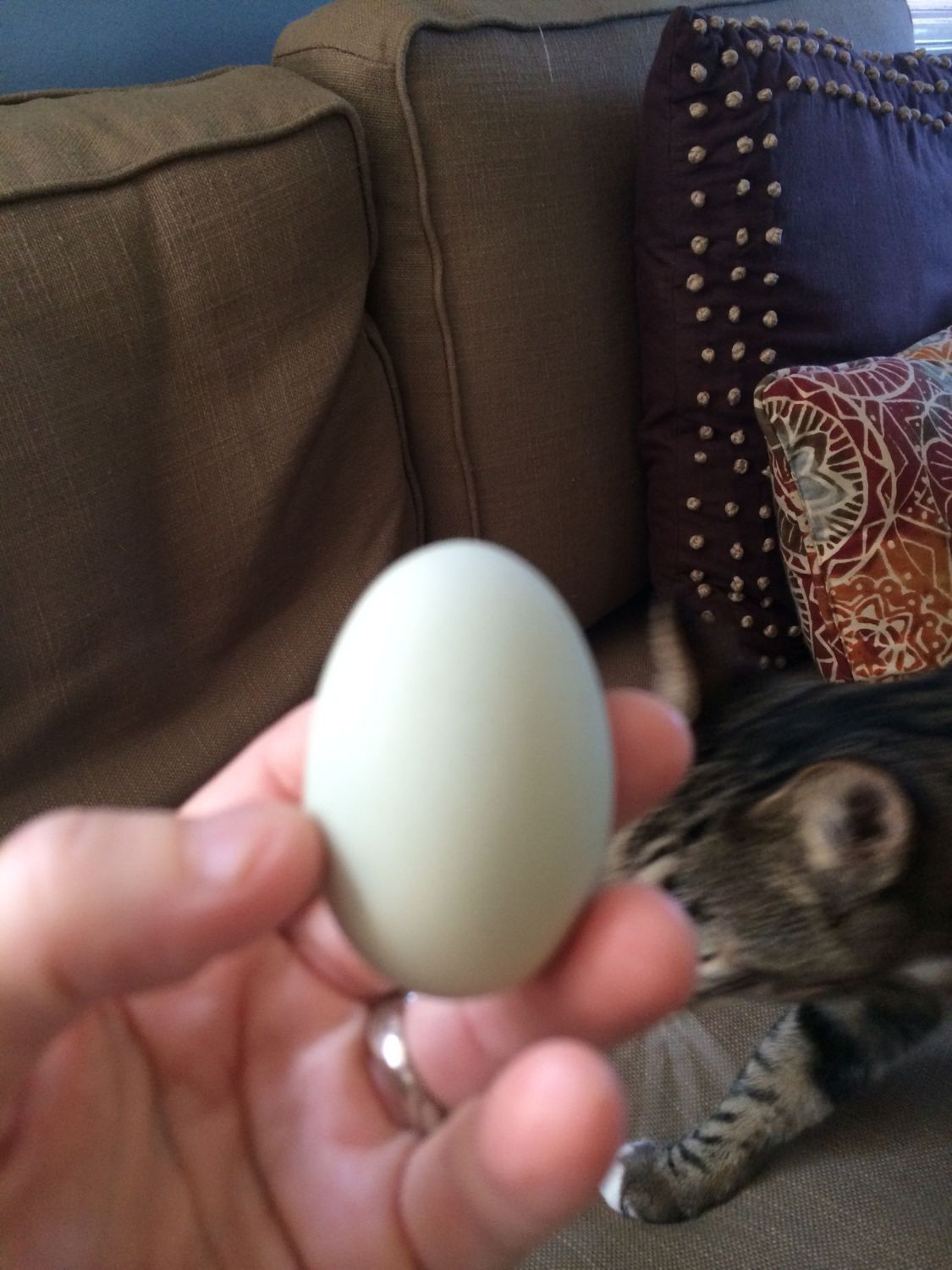 Got my first egg today!! So exciting! We have 3 EE's, we got them in April and we were told they were about a month old. So that would make them about 18 weeks old. Our egg is tiny and green. I don't know which one laid it since they've all been checking out the nesting box. Anyway, so very excited!!