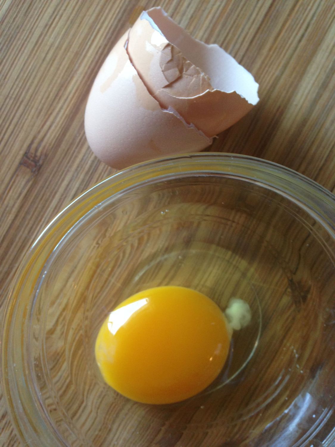 The egg was small and oblong (that store-bought egg in the bottom picture is an Extra Large, btw), and it had a really well-formed hard shell. I even had to crack it a couple of times when I went to open it up. I guess the calcium in that layer feed is doing the job. Here's the result.