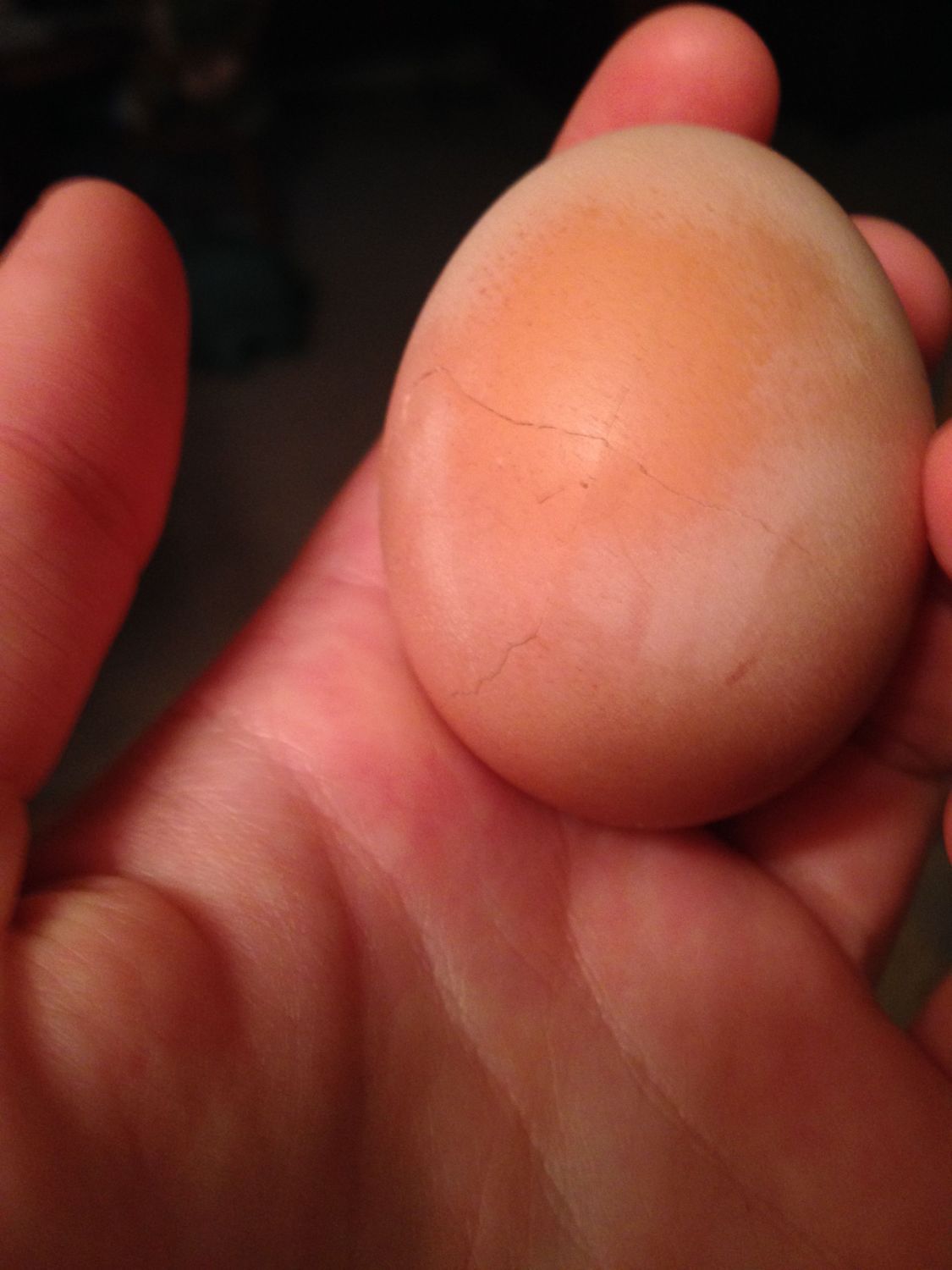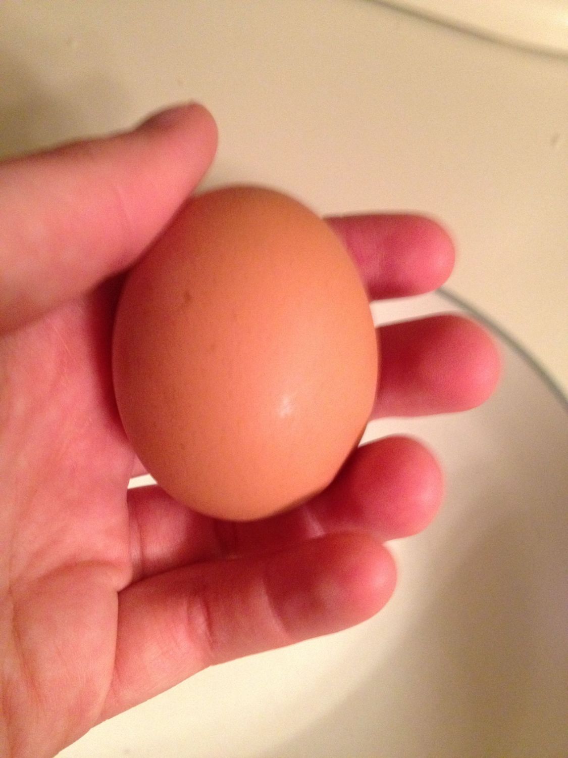 Yay for a first egg!I got an egg!!!!!!!e This morning I went out, lowered the ramp, and down rolled a little brown egg. I couldn't eat it though, because it had a crack on it