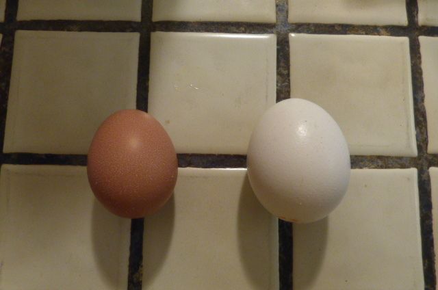 Ethel's first egg on the left; organic brown free-range locally-raised on the right