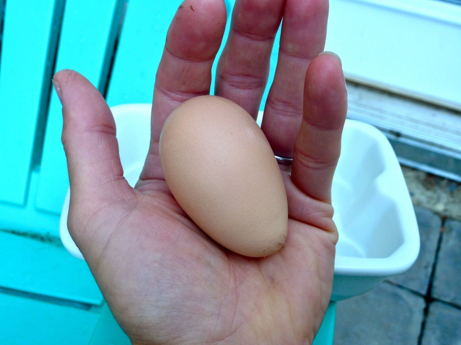 I have 12 young pullets. My oldest are Rhode Island Reds (or more accurately, Production Reds) and they are 21 weeks. I found my first egg in the egg box last night. Here's a picture of it.
