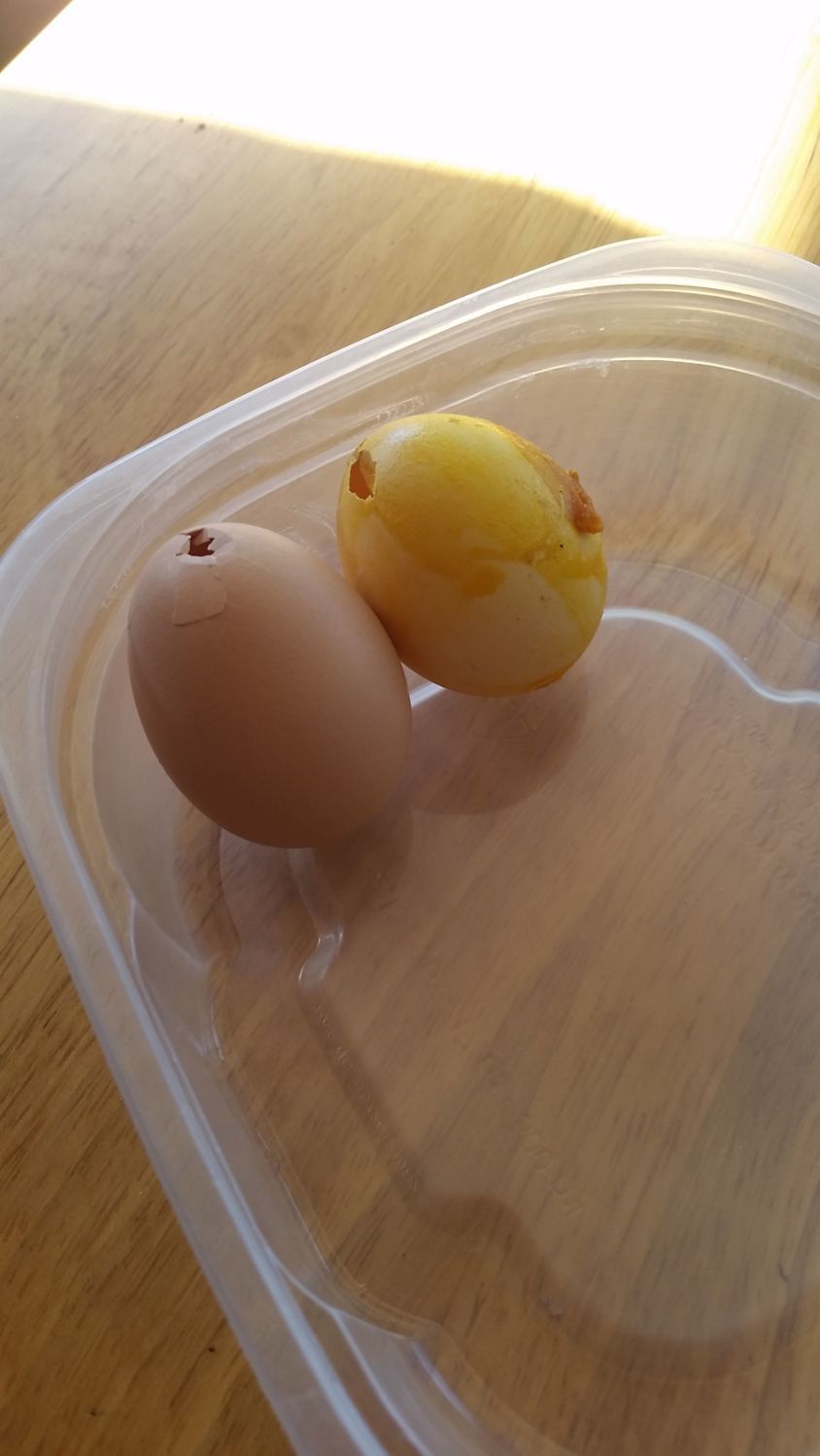 Came out to our first 2 eggs from 6 hens this morning... one was covered in yellow yuck while the other was clean. Both had been picked at too.