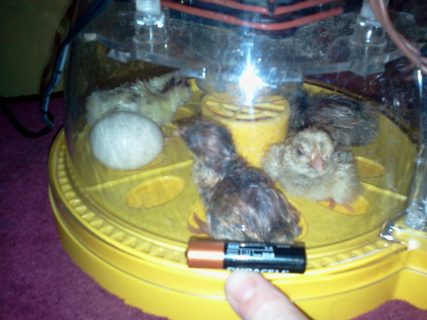 My first hatch and we were given 10 eggs that were 3 wks old. (My fault, kinda, my incubator turner did not work when I got it and had to send it back for repair, took extra 10 days). 5 eggs were duds but 4 out of the last 5 hatched with 1 still in the incubator. Was told to leave it in to about day 23. Eggs were Serama and Cochin mixes. All 4 are really small and 1 has the fuzzy feet like a Cochin. This is so addictive though, I am ready to go again.