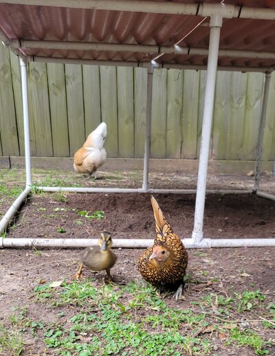 So, it finally happened. I had my first hawk attack. My flock of 11 is in their run all day and I only let them out when I am there. My broody Sebright hatched out a baby duck and 2 chicks. She wanted nothing to do with the chicks (they are now inside with me in a brooder, happy as can be with two purchased chicks) and attacked them, but she adores her baby duckling. I have 3 Cayuga duck eggs in the incubator due to hatch any day.