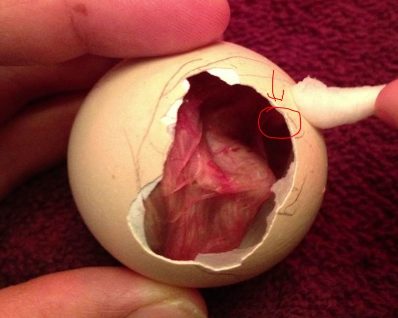 his beak is more than likely located at the LOWEST DIP IN THAT AIR CELL so take shell off as far as you can go down to the inner membranes, take the ointment and gently rub it all over that membrane and then feel with your finger for his beak or even his round big eyeball...... then get his beak free he is shrink wrapped, try to avoid as many major vessles as you can by pushing the aside make just enough of a hole at his beak to get his nostrile free.