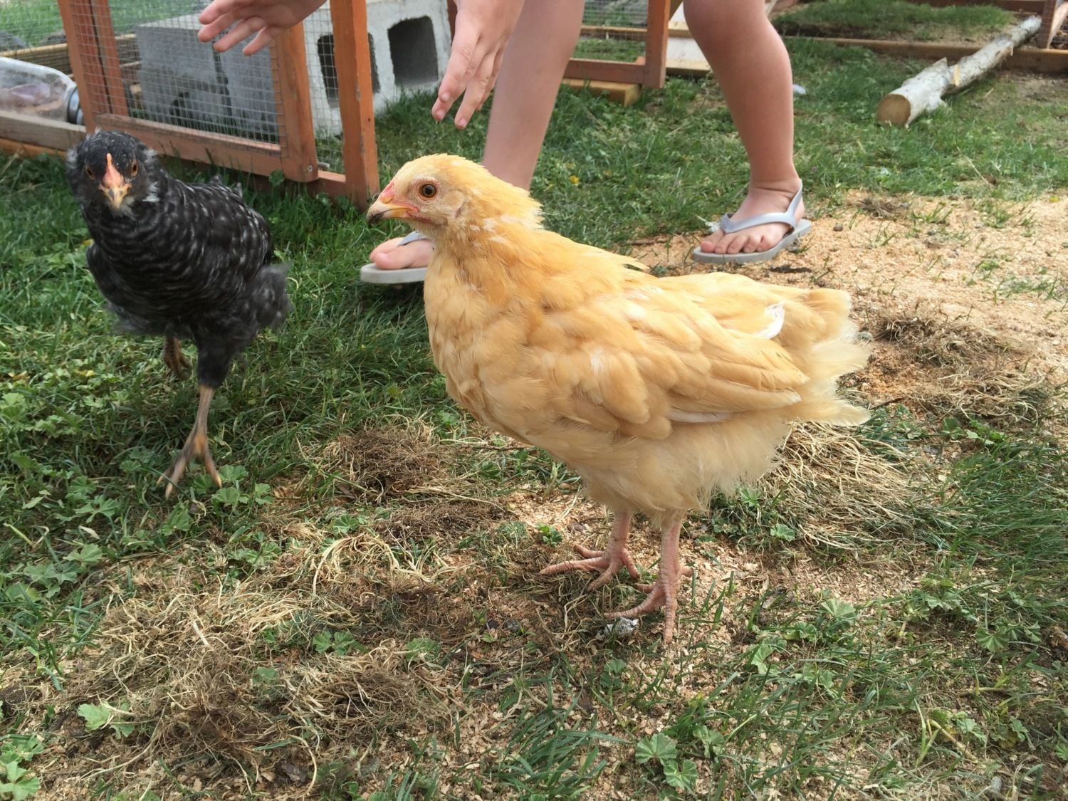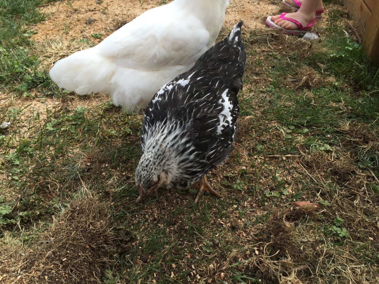 gorgeous chicks BTW, may I ask how old they are?? My 16 turned 4wks on yesterday and the babies just turned wk Monday.Finally got around to taking updated pic of the original crew out in their coop yesterday. With the helps of my little chicken wranglers, my girls love to help! Here is Lucy, the BO, and then Ethel, the BR being chased by my daughter. They will somewhat run away from my girls, but they come right up to me and want to be held. And they follow me around everywhere.And Rose, our stunning white EE. She is top chicken.