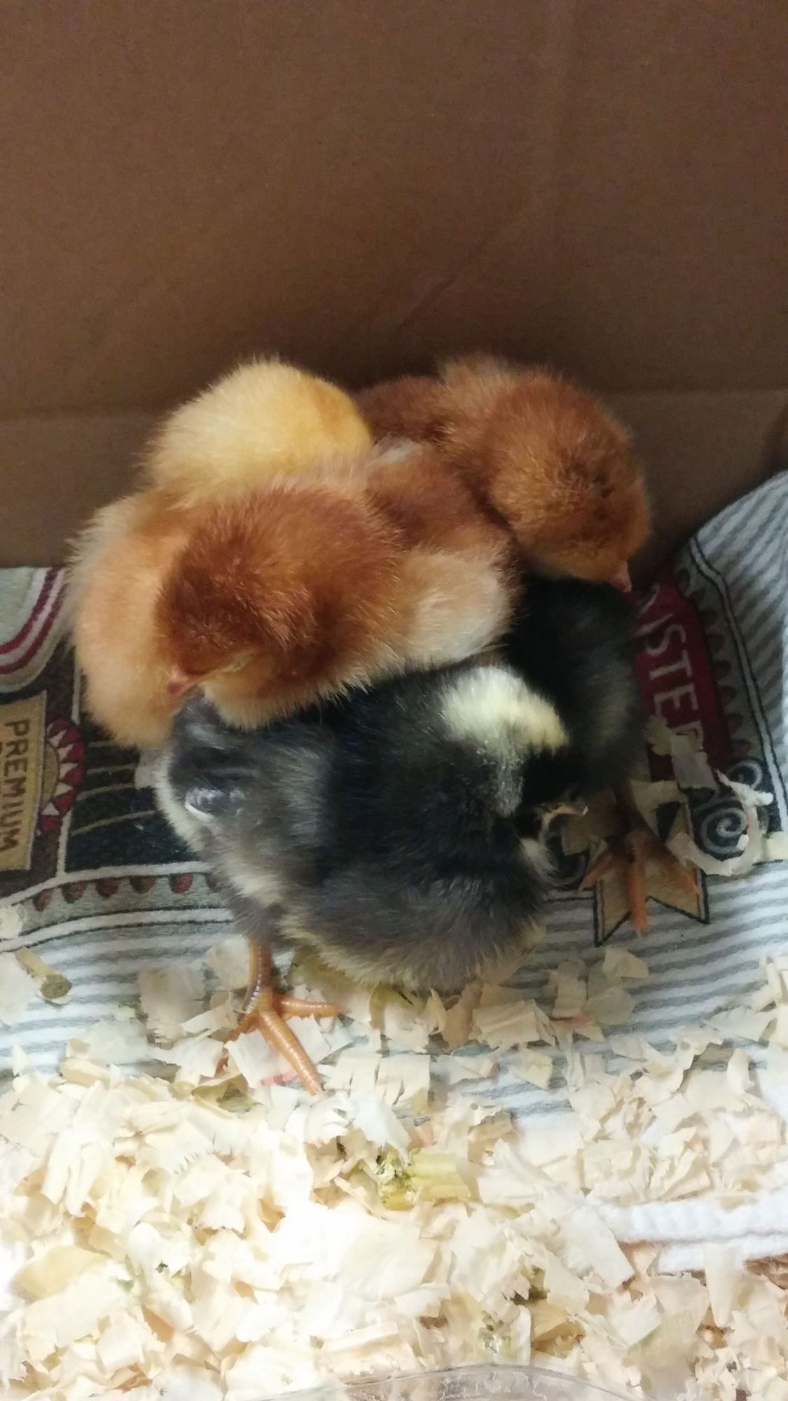 My babies (2 RIR, 2 barred rock, 1 golden comet) are sleeping happily while I attempt to get some work done. I think I'm singlehandedly responsible for an overall drop in productivity today