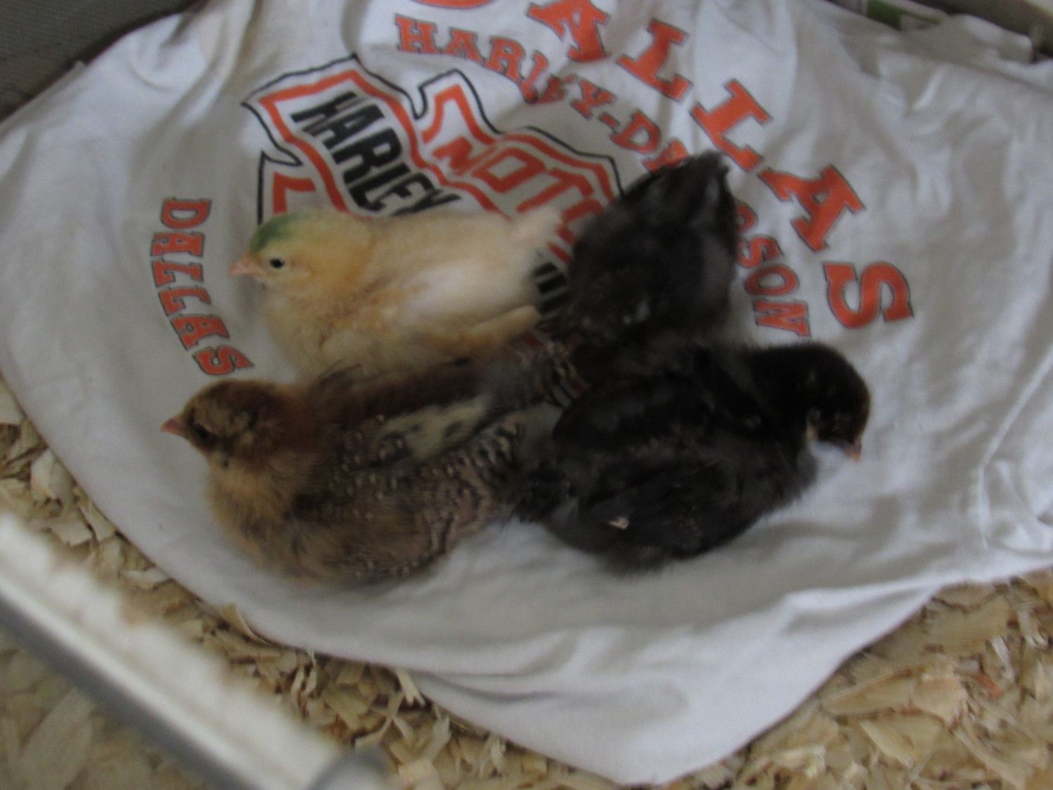 What a great clever idea for your brooder. I love it!!!!After our wet bedding incident this morning, we haven't had another one! I actually changed brooders today. I made one from an old kiddie pool and plastic bin lids to bins that had cracked and been thrown away. I duck taped the lids together in a circle and We were off. I am pleased to report that we now have all 11 chicks of three different sizes (approx. 1wk, 3wk and 8wk) in the same brooder. The 3wk guys are little hellions so they have distracted everyone from the size difference between the 1wks and the 8wk (which was a problem yesterday morning before we had gotten the 3wks).![]()