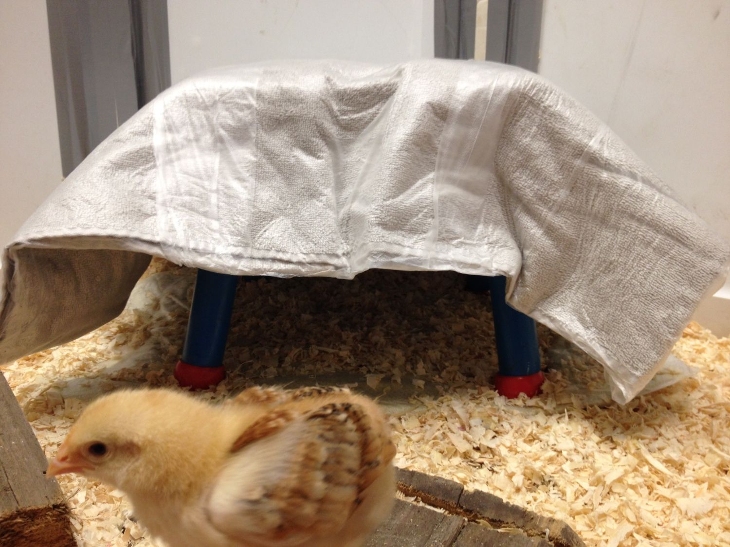 The ideal situation is to drape the heating pad over the frame. A towel with Press N' Seal can go on top of that, just laid in it - because they will want to spend time up there and you don't want them pooping all over the pad. That's it, simple and easy. When people try to overthink it, chicks suffer. Remember that too hot is always more dangerous than some chill, and 60 degrees is NOT cold.