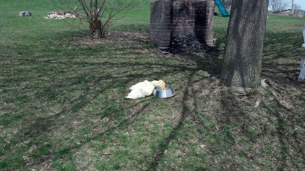 They do have water. there is a 1 chicken water feeder in the garage, Another bowl of water in the yard between the garage and the garden shed, and 2 bowls of water in the garden shed. I also gave them a small cat litter pan full of water to "swim" in, but the ducks are already so big that they don't even fit in there together, so they have to take turns splashing in it. I will be buying them one of those kids swimming pools in the near future, and have been starting to plan a pond that I want to start building either this summer or next summer.