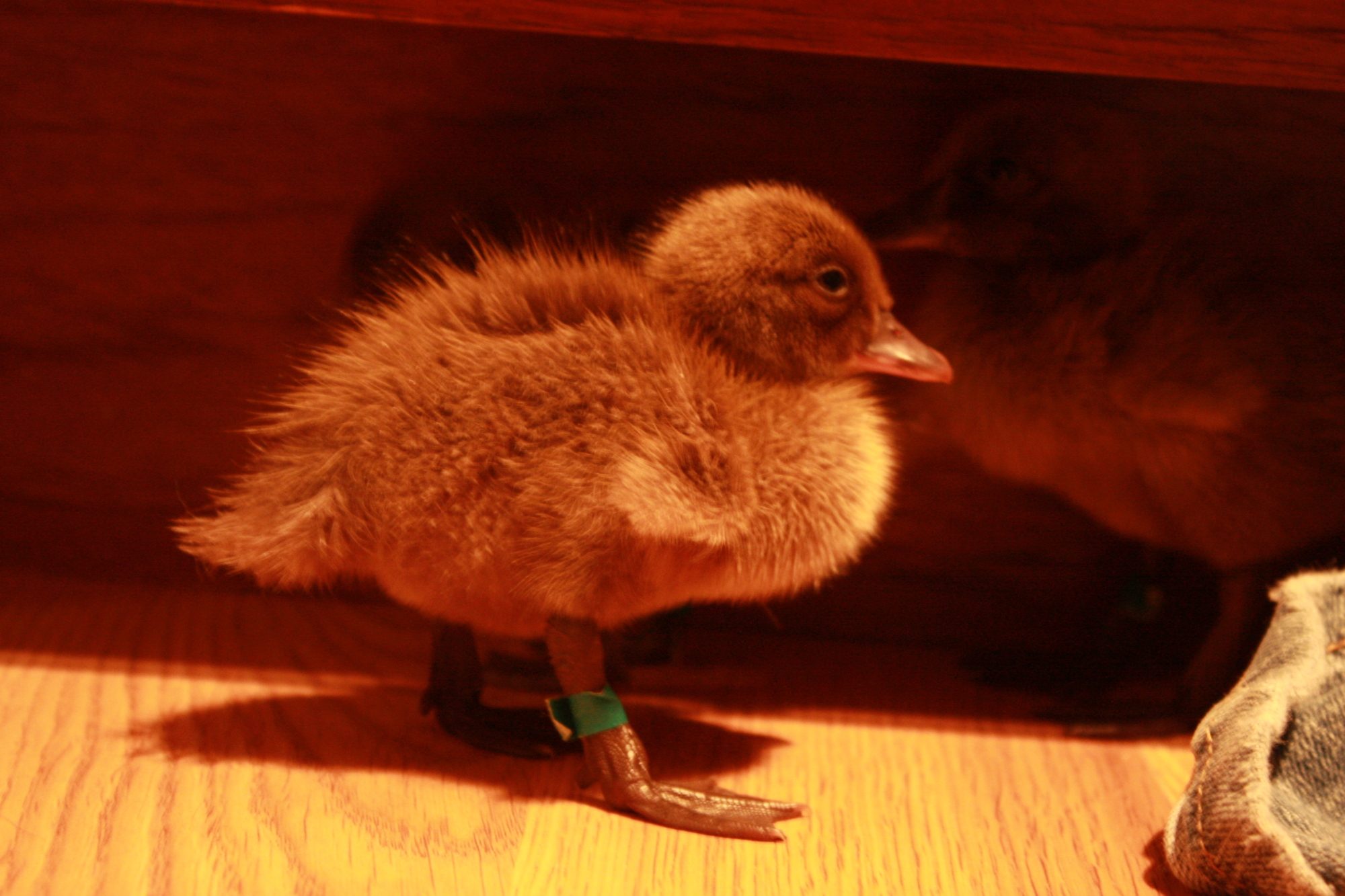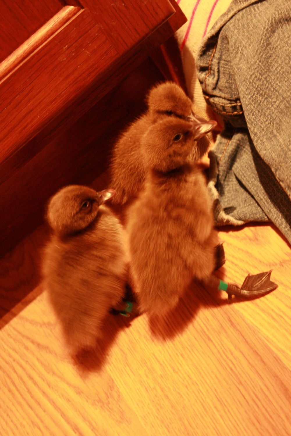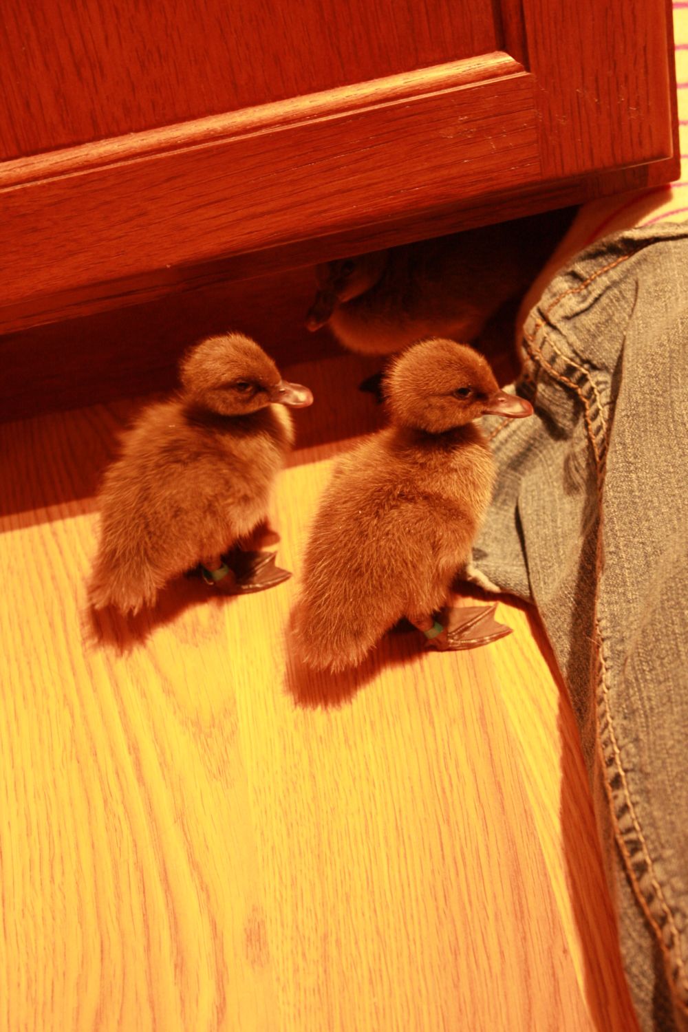 Here are some pics. These first 3 were actually taken on Wednesday evening (Day 1.) The duckies were still pretty scared of us then, you can see them hiding under the lip of the kitchen cabinet.