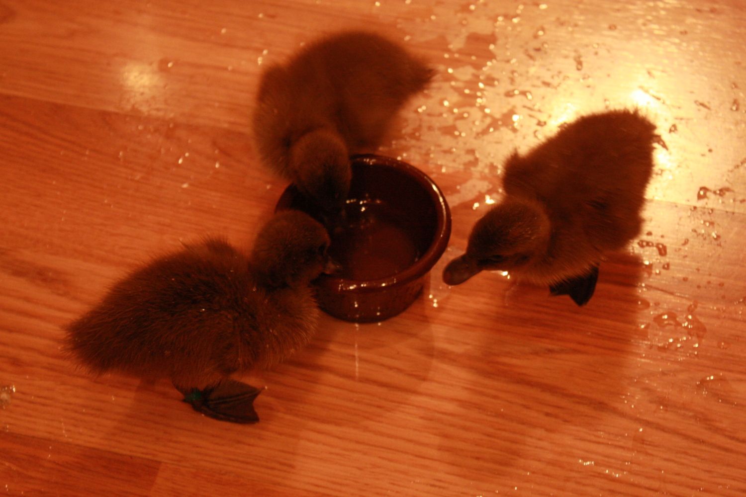 The little dish you see them drinking from is a little tiny condiments dish, probably about 2" in diameter, that we put in the middle of the kitchen floor and let the ducklings drink from. They were so excited! But the funniest thing was that even though the dish is tiny, all 3 of them kept trying to swim in it. The dish was so small their bodies can’t fit in it, so they would end up sitting on it with just their little feet in the water. It took them less than 5 minutes to get all that water splashed out onto the floor.
