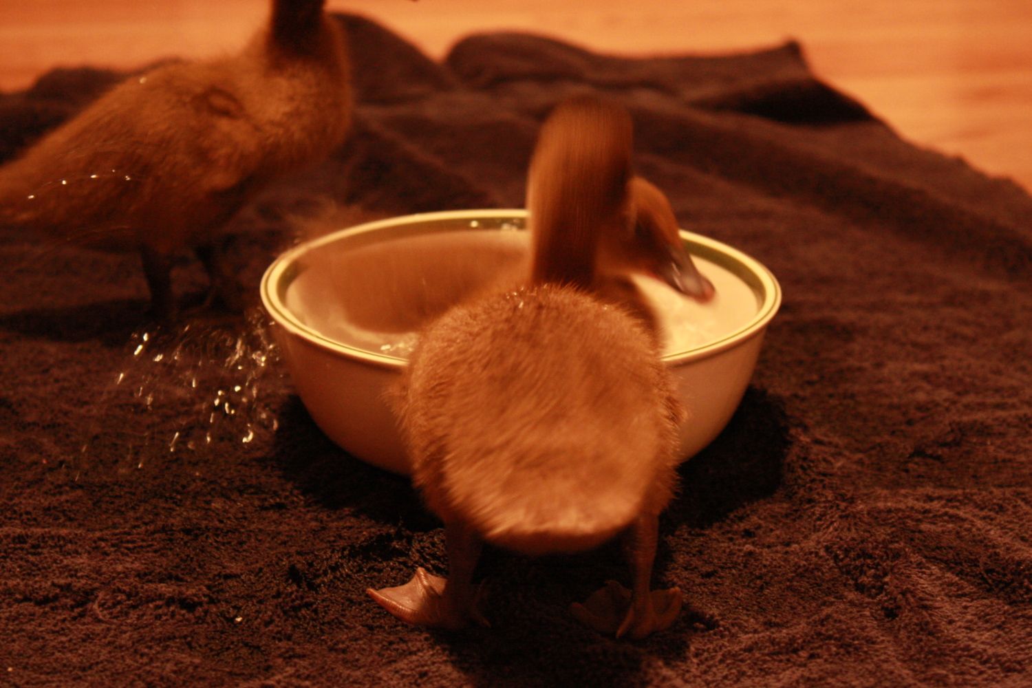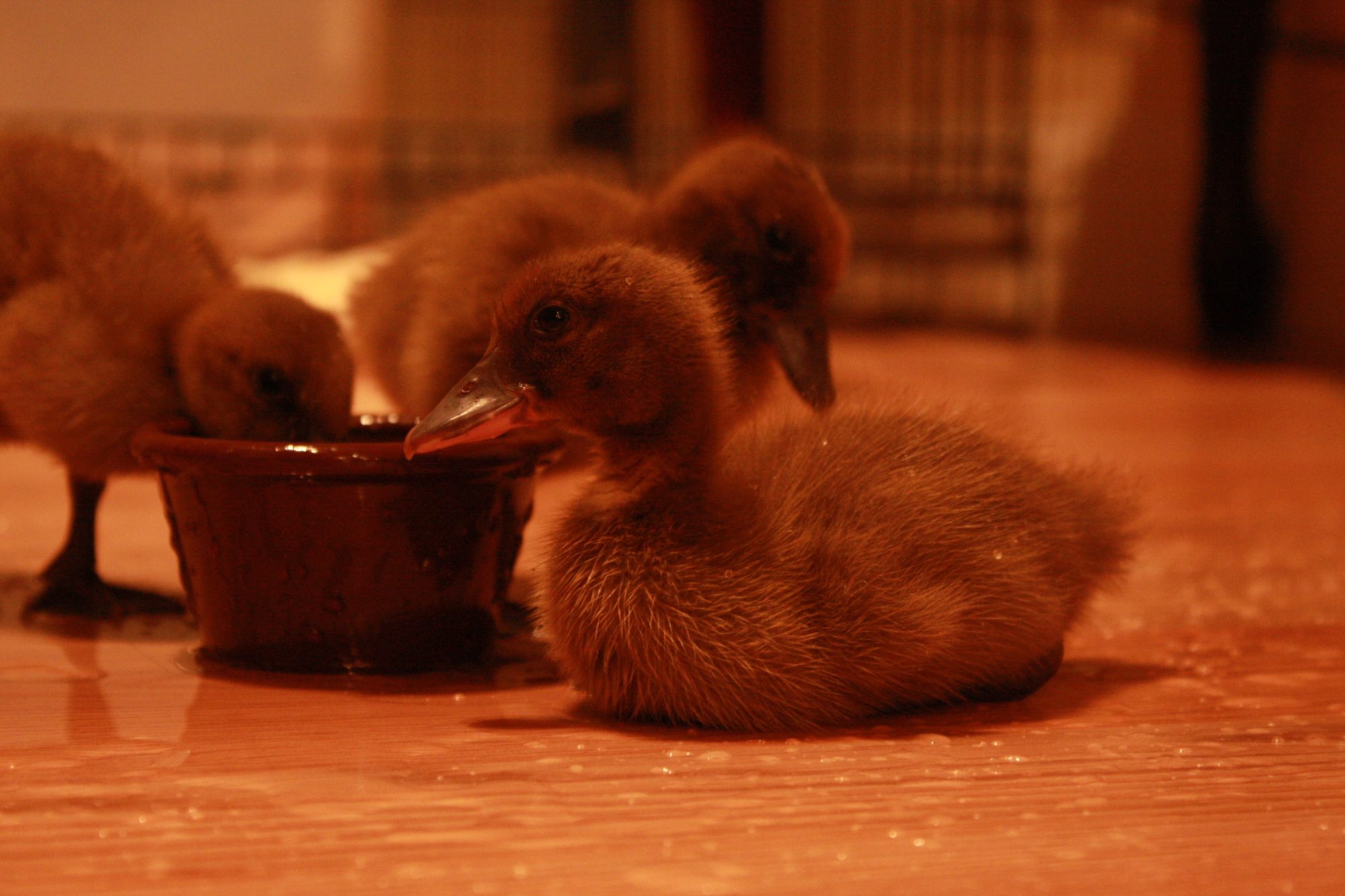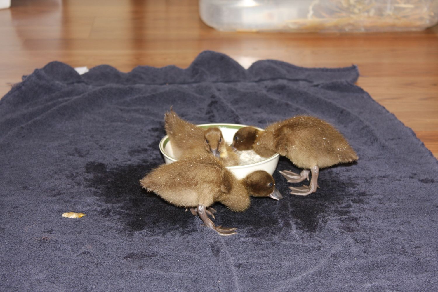 Today is day 7 of my duckling experience. The little girls are now exactly 8 days old. They have grown so much, they no longer look like little balls of fluff, but instead they look like small ducks. They are out-growing their current brooder faster than I anticipated,I think I can get at most another week out of it. Today I will be getting them a new food dish, since they are now emptying the current one every 4 or 5 hours. I am also going to need a new waterer, for the same reason. I am seriously considering buying a tub of coolwhip, just to empty it out and use the container as a waterer like I’ve seen elsewhere on this forum. Seems wasteful – maybe I can empty it into a tupperware so it won’t all go to waste.