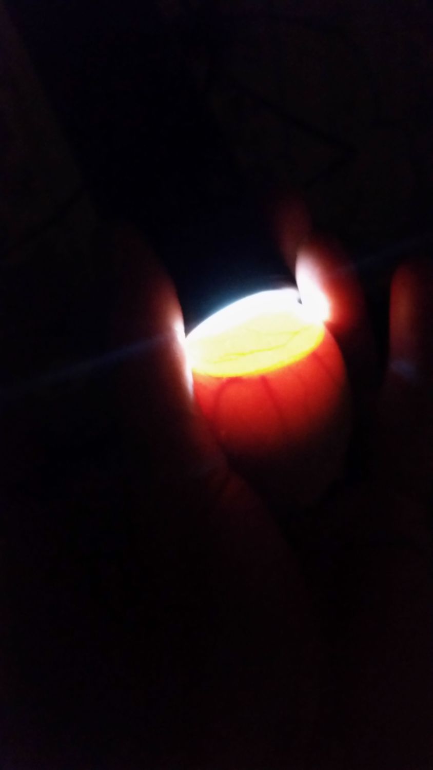 What you want to see are distinct blood vessels running up to the air cell, so the best candling method is to have the fat end of the egg up and shine the light down into it. If you can see distinct blood vessels and a red glow, the embryo is alive. Like this:
