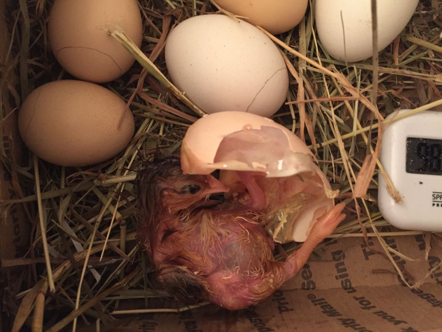 A chick is born!!! Our first! I put him back (think its a rooster) in the incubator. I turned the other egg that was hatching feet first up so that its beak was pointed up. Also moistened that one too.