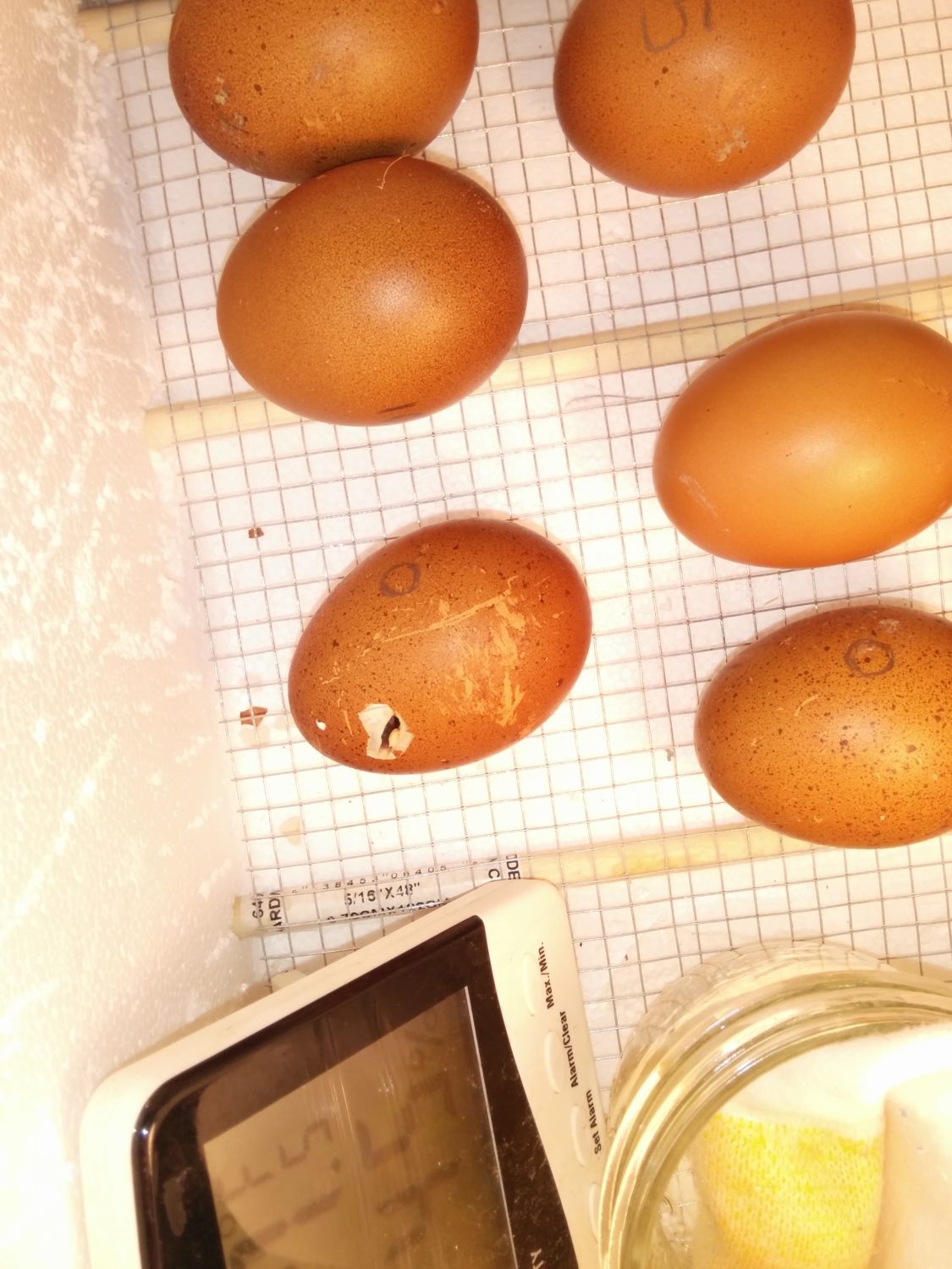 I made an incubator with a thermostat from a hot water heater I had to replace and I just got my first pip today. I opened it to get it setup with another container for water to raise the humidity for the lock down. While doing so I got my finger stuck in the fan and it startled me and I jerked which caused the eggs to all roll around & bang together. I was bummed when I realized I broke one but upon further examination there's a little beak sticking out of it(I didn't break it!).