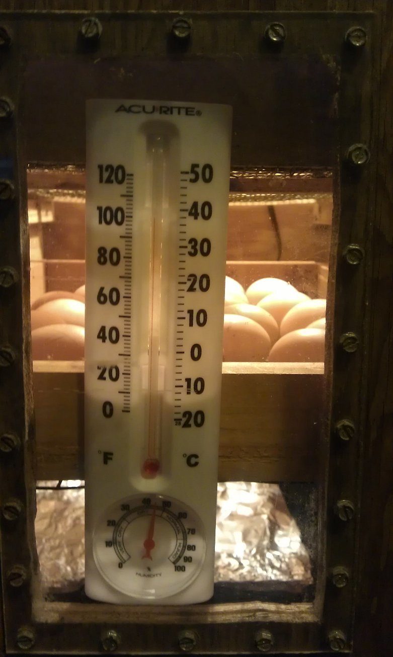 I was trying to show the eggs in here. But mostly got the thermometer. LOL. Set 20 RIR eggs from my hens yesterday. Have 5 Pekin duck eggs on top. Just for the heck of it.