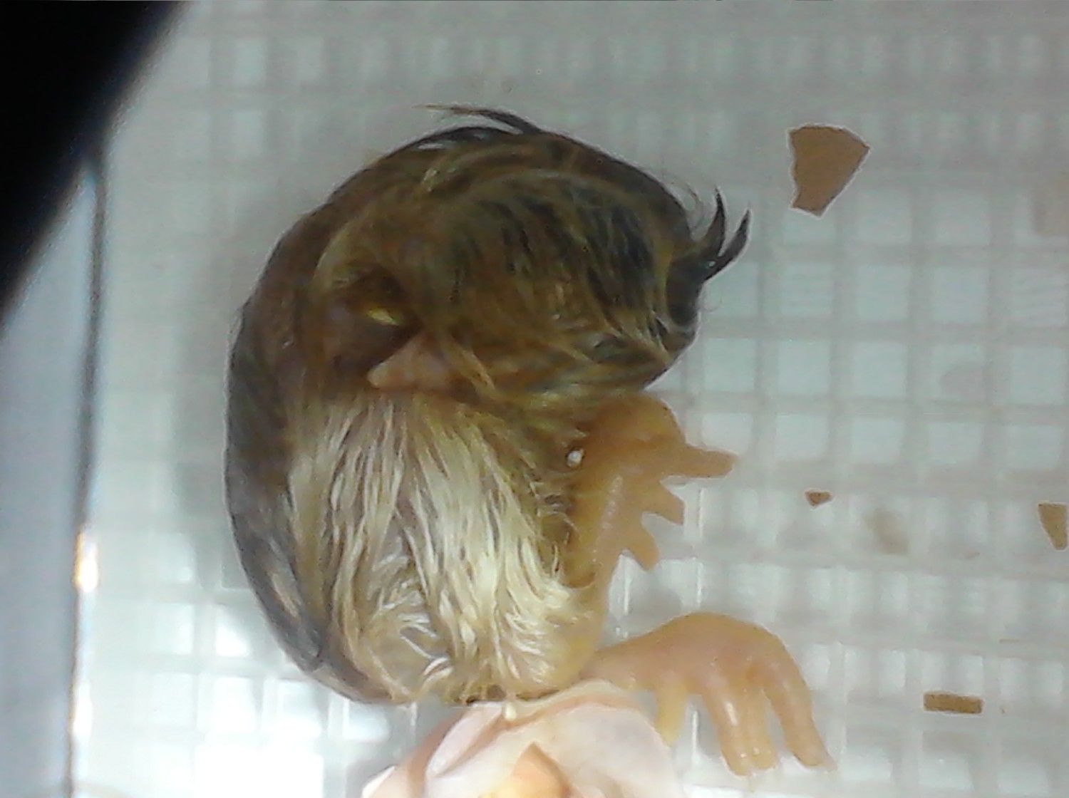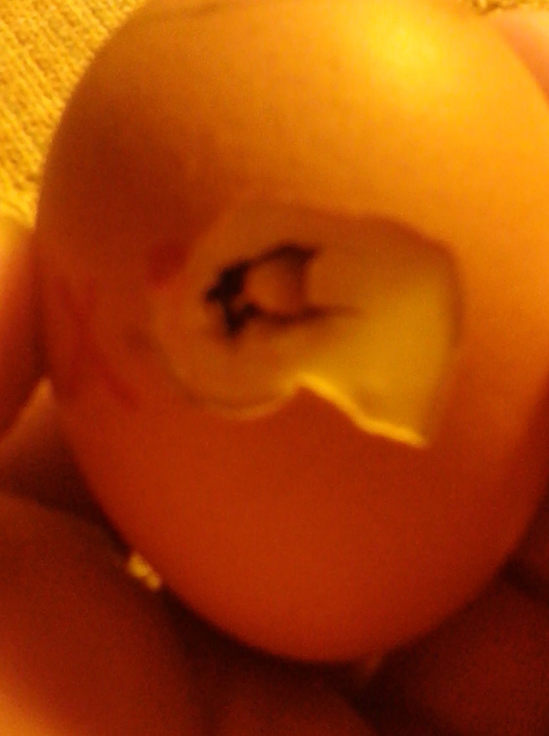 Here's the malpositioned one. His beak was under his right wing, but he pipped in the middle, outside of the air cell. I guess his beak didn't point up far enough or maybe his whole body was just sitting at the wrong angle. I did like you did, I helped and put him back, helped and put him back, etc. to see if he could do anything on his own. He wasn't getting anywhere and went from lots of peeps this morning to nothing, so I figured he was getting weaker. I went ahead and help him out after seeing he wasn't going to do it on his own, and this is right after. It's like he is stuck in the fetal position. He does move around some and chirp now, but I have a feeling he isn't going to make it.