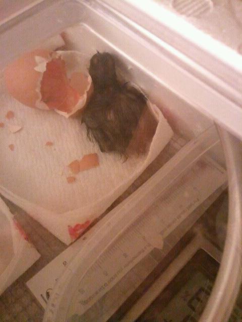 We ate dinner, looked at the eggs, checked temp and humidity. An hour later I walked by and glanced in and we have one new little member!!! Totally surprised to see it hatched already as we were not expecting it until Saturday!! Now we have to do a wild rush to get the brooder ready!!!