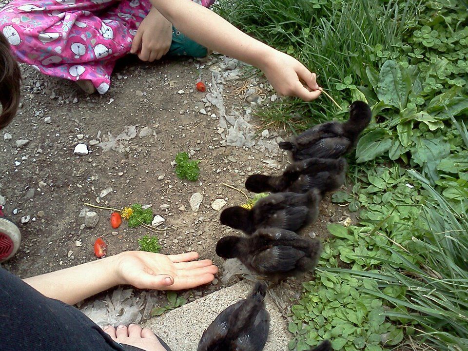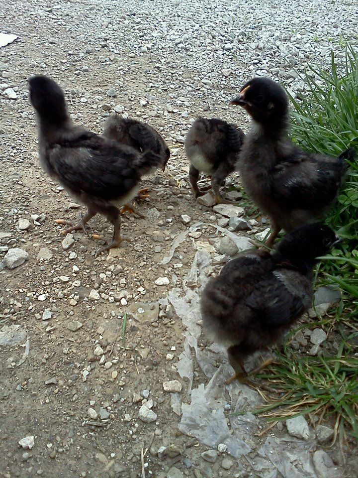 They had so much fun that they had no interest in coming back in! It took them a while to actually get out of the cage... I finally just took the top off (it's a guinea pig cage) and then they were all out within a minute or two. They had a great time pecking the driveway for grit, eating ants and worms, and chasing each other around. It was lots of fun.