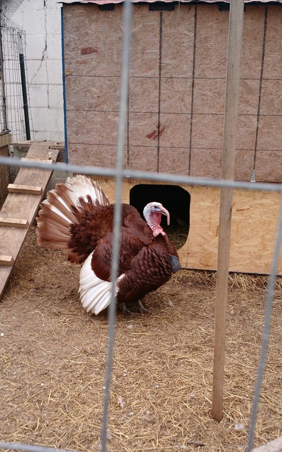 my Burbon Red Tom stands guard over the enterance to where my two hens are sitting on their clutches