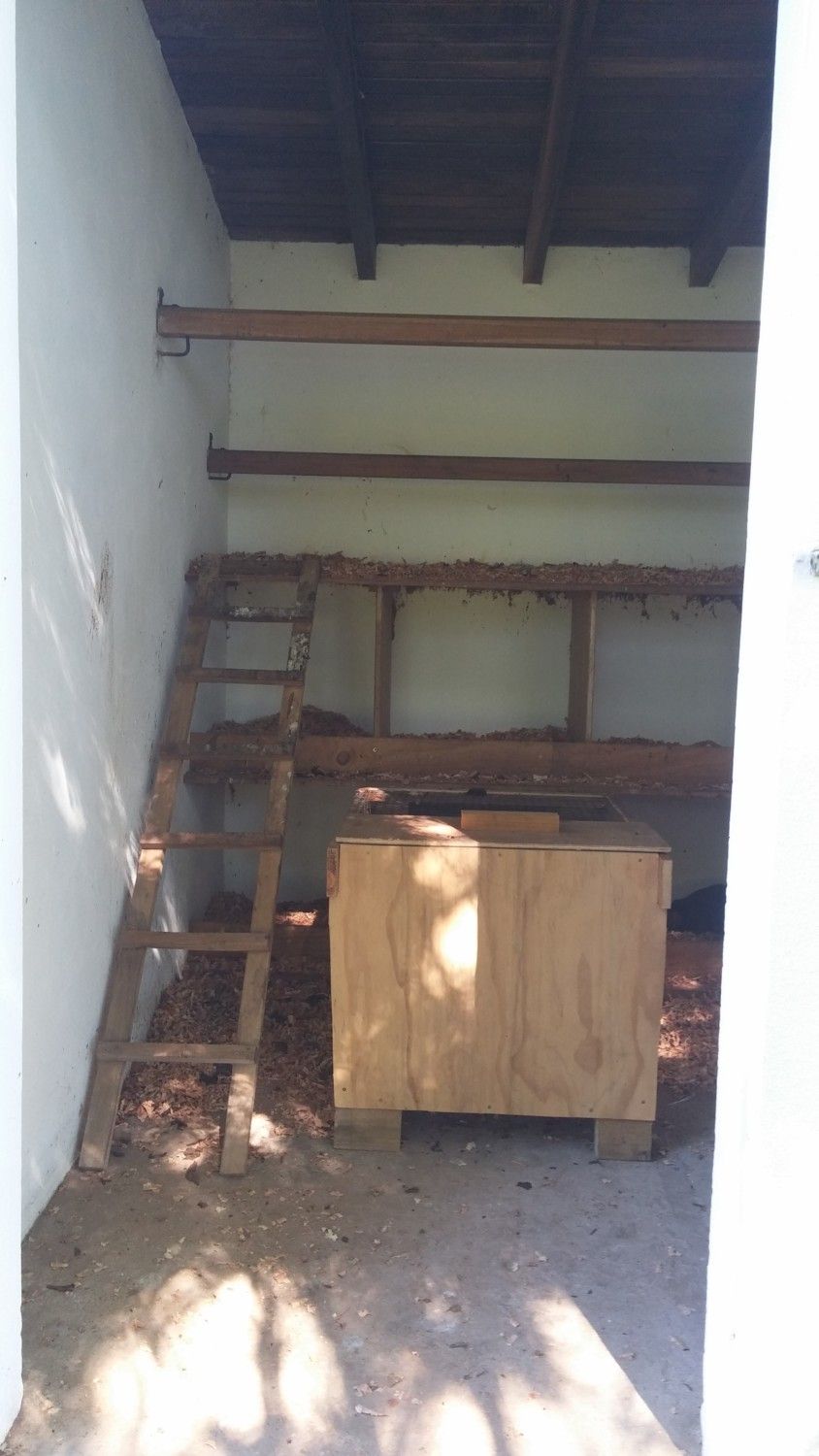 Poop from the back roost hits the upper bench and some hens demand to lay in it during the day, poop from the front higher roost hits the ground, walls and the ladder.