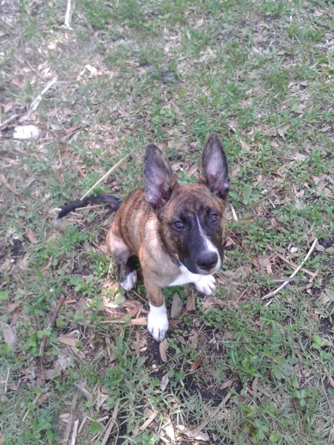sad to see her go, but we don't have the money to put lattice around the underside of our house and she will NOT stay out from under there. She has torn up about $600 worth of ducts and we just can't afford it right now. We have to put her on a lead when she is outside, and that kills the point of having her. She was meant to be a guard dog, but isn't. She is German Shepherd/ Staffordshire bull mix puppy, about six months old. She is trained to some voice and hand commands, but I haven't had the time to work with her that she need (since I have a special needs child, and am in school for paramedic). She is loving and good with my kids. If anyone knows someone that wants a good dog, please let me know! Her name is Lady Isabella, or Bella for short. This is her, taken about a month ago.