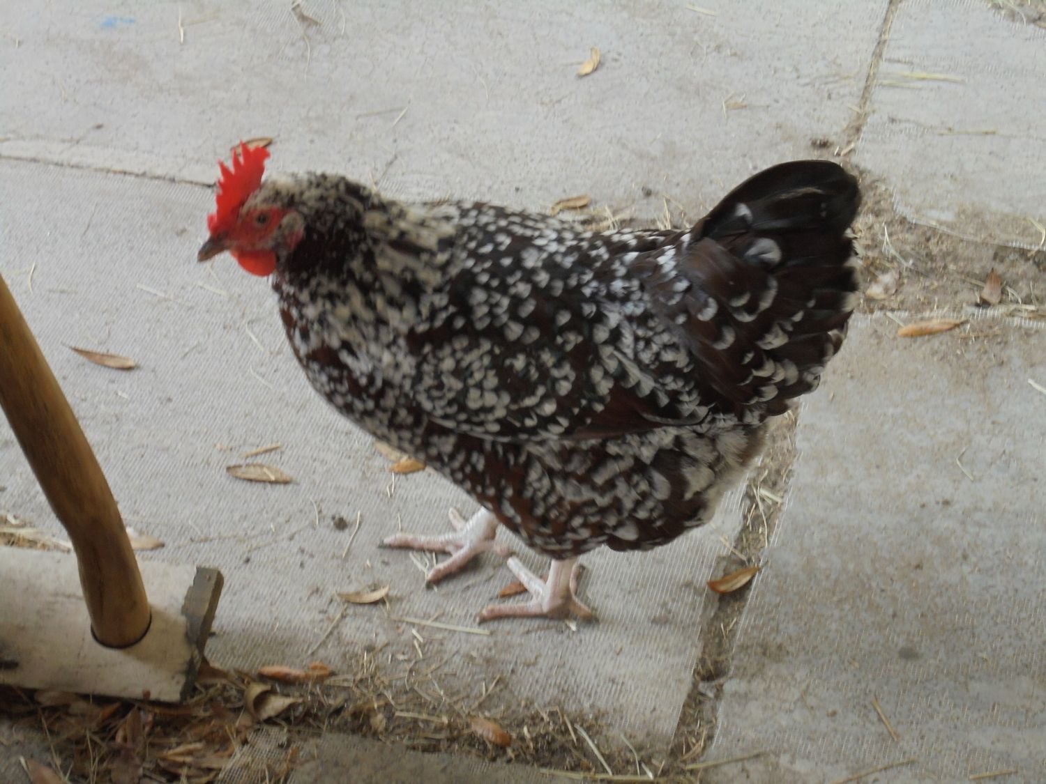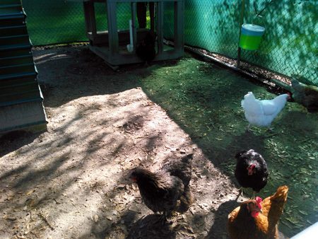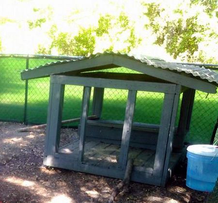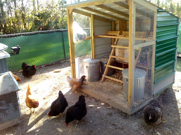 Where they live - My coop is basically 6 feet tall, with a slanted aluminum roof, by 6 feet deep. The back wall is solid, aluminum, and 4 feet of both side walls are solid, giving them protection on three sides. The rest is hardware cloth, with a solid deck flooring. There's 4 nesting boxes on the deck and 4 across the back at about 4 feet. They have a roosting ladder from deck to boxes and a roosting bar (made from 2"x2"s) that go across just inside of the solid side walls, so 3 1/2 feet out and 5 feet off the deck. Their "run" or chicken yard, as I call it, is 23' x 23' square. They have plenty of shade trees and also a "cabana" (previous owners left an old dog house, so we took the sides off all around, cut down the legs, leaving the deck floor and tin roof. Now the chickens have a place to get off the ground and under cover in case of rain or too much sun.)
