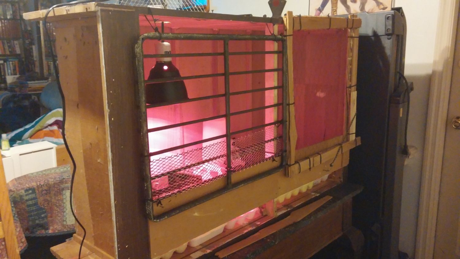 Also, wanted to show my "new" brooder. My daughter got herself a new dresser (her mom's from when she was growing up) we just got the dresser and night side table from her mom's place this past 2 weeks ago. Kid loves it, told her friends it's vintage! So I turned around and repurposed the old dresser. Took the supports the drawers sat on and stacked them on the ends and near dead center, on the bottom.