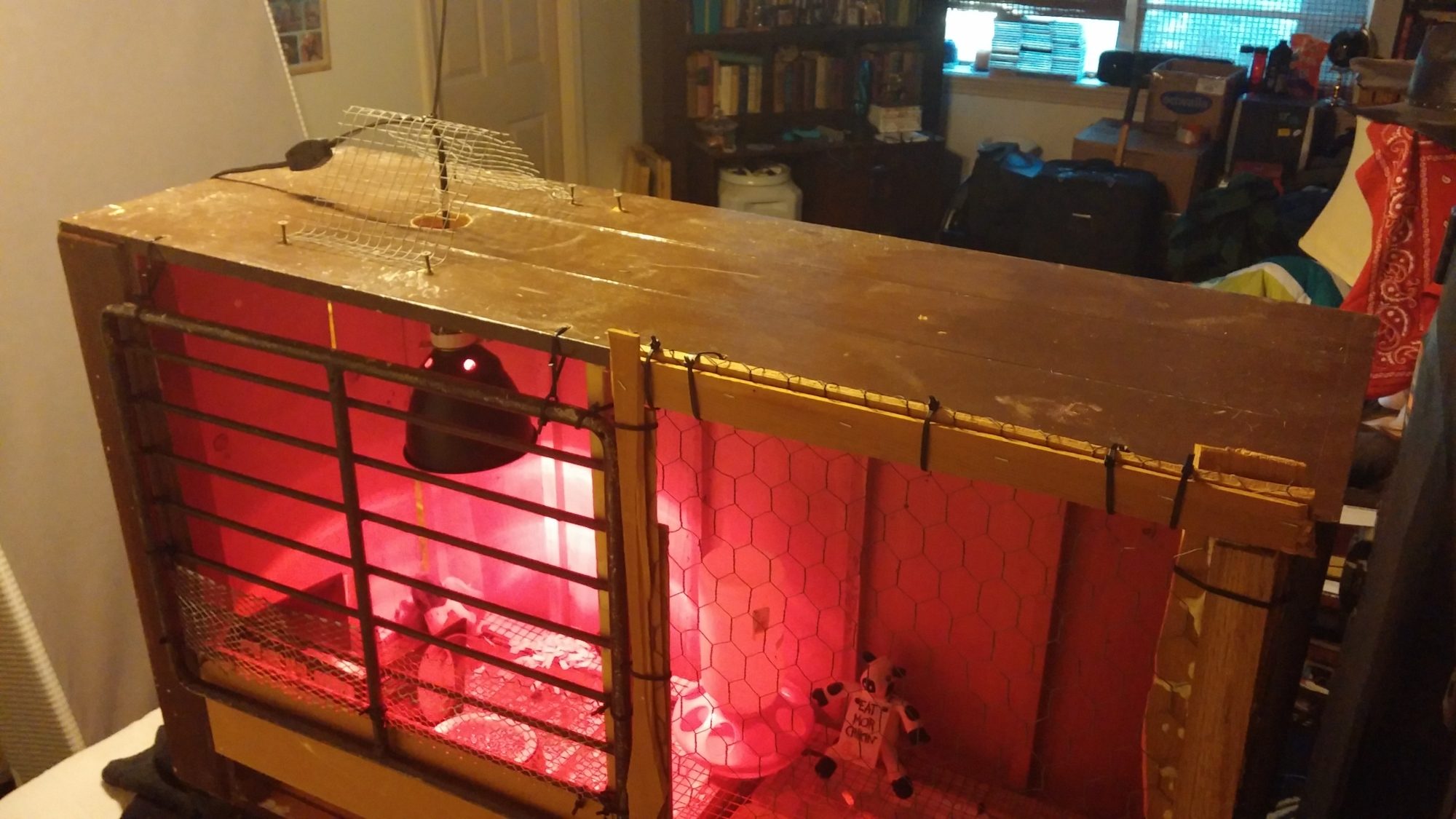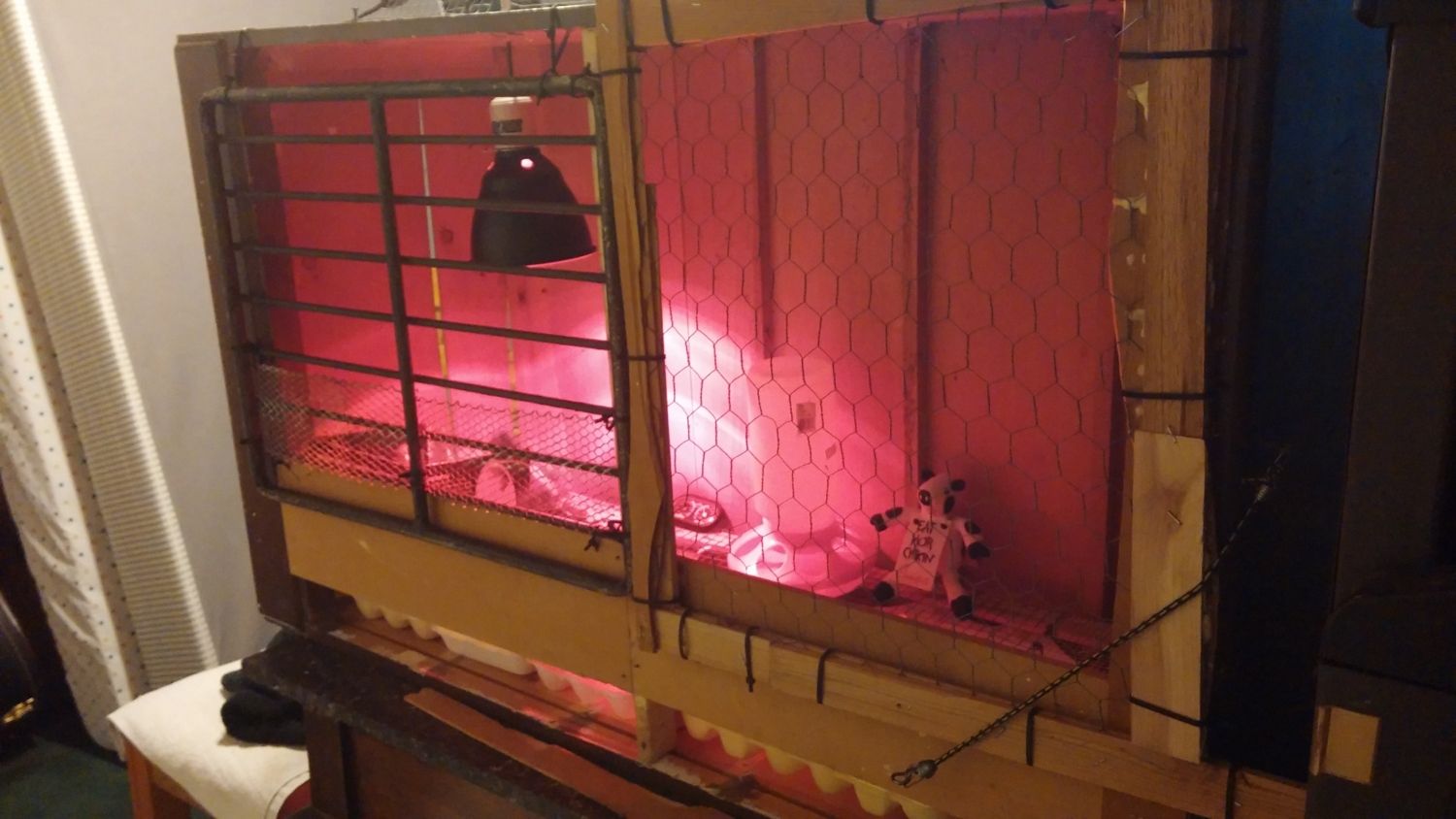 Announcement! One of our 6 month old chicks laid her first egg this morning! Yeppie!! The white is a large (store bought) Way to go Jeanie! Not a bad size for her first egg! Plus while at the feed store, my wife saw the new chicks and...yep...two new chicks at our ark, I mean place. Both are R. I. Reds. She's been wanting some for ages. Also, wanted to show my "new" brooder. My daughter got herself a new dresser (her mom's from when she was growing up) we just got the dresser and night side table from her mom's place this past 2 weeks ago. Kid loves it, told her friends it's vintage! So I turned around and repurposed the old dresser. Took the supports the drawers sat on and stacked them on the ends and near dead center, on the bottom. Put the wire cloth over the supports and tacked them down. Used the sides of one of the drawers and put that in front of the wire floor. (This elevated it so I got baby poop that can drop down into egg cartons for easy clean up! You can see them right clear in these pictures. Set an upright near dead center (scrap wood) used an old grate from my junk pile...little scrap of small chicken wire and shims zipped tied together and secured with gorilla glue make up the lift gate... Drilled a hole up top and supported the light with a bit of cloth wire...drilled in some screws to hold that in place. This way I can adjust the height.. Bungee cord to secure the lift gate in place at the corner and it all cost me...nada.! Zero deniro! All repurposed materials baby! Wife thinks my addition of the Eat More Chicken cow is"Just wrong" I think it's funny. The also got a duck to cuddle but she didnt say nothing about that now did she? Newp. Oh...Names are: On top pf the duck is Lucy. In the nest box is Scarlet. Ain't they cute!