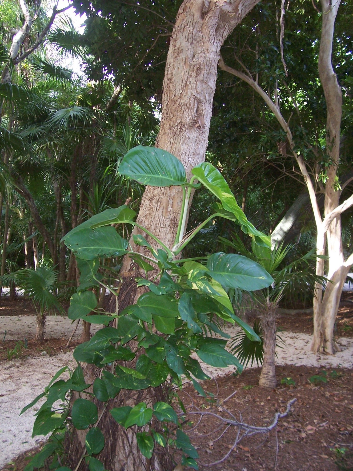 This cactus was in bloom and was dropping sections on the ground...The mother plant was 8 feet tall with a smooth trunk that was 6 inches in diameter and the flowers were orange. It was growing in the part shade of the canopy in the garden.