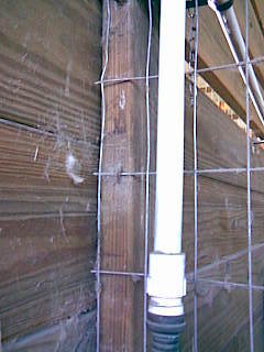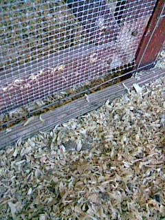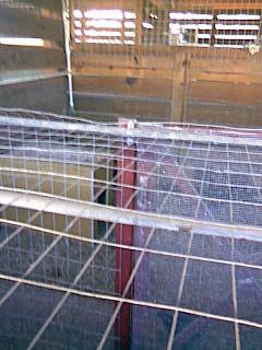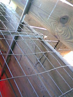 First I mounted a 1x3 across the bottom at the same place a pre-existing 1x6 on the side walls. I placed a metal pipe in the gap between the wall boards just above the 1x3 and held it in place with pipe clamps. The bottom of the fence was u-nailed to the 1x3, the sides to the 1x6 s and the top clamped temporarily to the pipe. The top of the fence was 4 inches above the pipe. I then placed another pipe half way between the fence I just mounted and the outside wall for extra support. This is not clamped down. I put another piece of fence on top cutting out squares to allow the 1x6 to fit in the notch and allow the fence to slip between the gap in the outside wall boards. The fence was u-nailed to the boards they were resting on at the back and the sides the front was temporarily clamped to the pipe at the front. I wired the roof and the front to the pipe with wire twist ties. You could use zip ties but I didn't have any. I attached the side frames for the door to the 1x3 and the pipe. I cut out the hole for the door leaving the top and bottom of the fence intact. Mounted the door and bent the 4 inches of fence that was sticking up flush with roof.