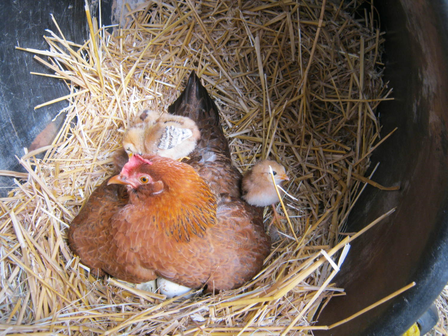 Awwww! That is a good set up for them. If I do get eggs, and she does sit on them (she spends all day on the eggs, and only has gotten up every other day to feed and run around for a bit) then I am going to have to rearrange my other two chickens that sleep in the coop that her nesting box is in. I guess I should get moving and build the coops I have been planning on!