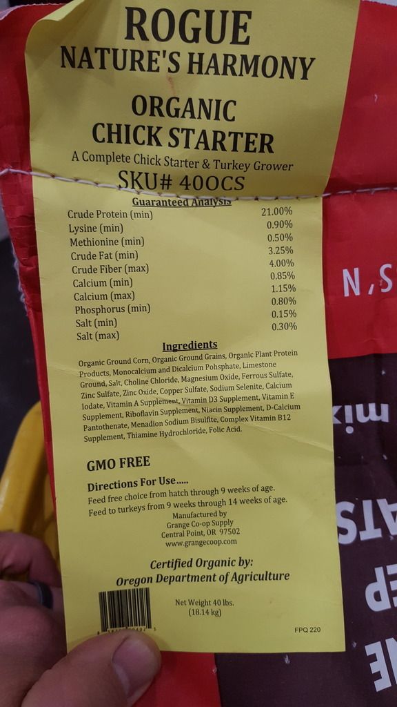 We've been prepping for our ducklings to arrive in a few weeks and need to decide on a feed. I know that ducklings need 20-22% for the first two weeks (for optimum growth, per Storey's Guide), and that the vitamins and minerals are important. I've not seen a full breakdown of various quantities required of which vitamins and whatnot though. rather than stress over it, I figured that most commercially available foods ought to be pretty close so long as I wasn't getting the absolute cheapest possible food out there. I wanted to get some organic non-GMO feed and found some at the local feed store.