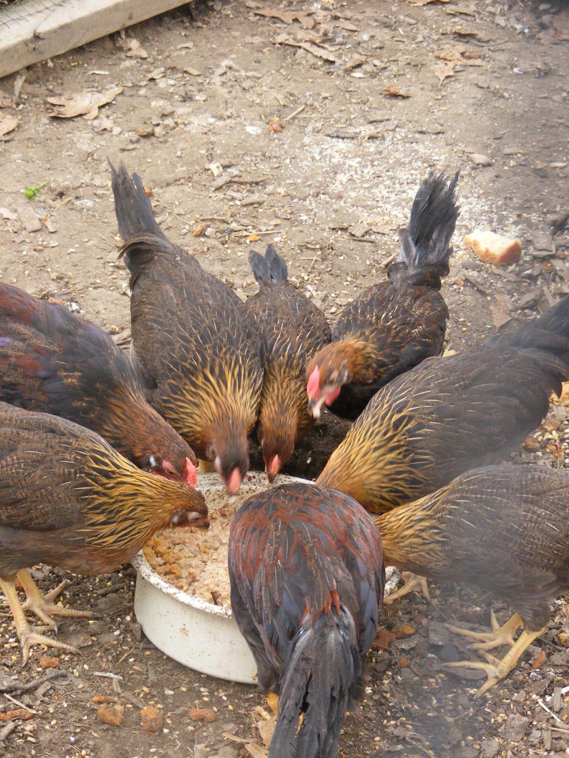 When I've got enough of such scraps saved up, it's chicken feeding time! The meat scraps all come out of the freezer, get cooked long enough to sterilize/soften and the whole batch gets put into the blender, eggs with shells and all. Whipped and chopped in the blender, pour it into a ceramic "meat loaf" type pan, microwave it into a big, oddly colored soufflé!