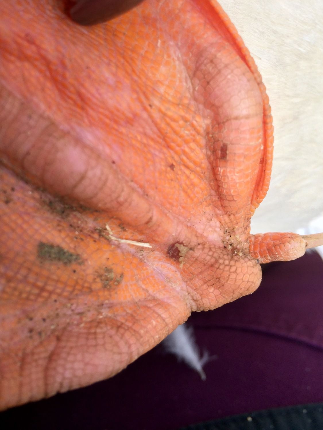 We have been having a really tough winter with frigid temps and freezing rain. For the last month, they have been in their new yard which is covered in wash sand. They spend the nights in their house which is deep litter of straw and pine shavings. I try to rake the sand to keep it soft, but when it's 4 degrees and covered in ice, it's tough. Half of their yard has a roof though and that sand stays soft. They also have a little place to hide out of the wind, under that roof, but still in the sun, which is covered in about 5 inches of straw. When I rake the frozen sand and break it up, their are lots of clumps, which end up being like walking on rocks or pea gravel probably. Should I not try to brake it up? We are getting more ice today and tomorrow. Lovely. So, does that look like the start of bumblefoot? Scared for my girls! Completely willing to bring them in to treat. I will go and read the right threads if some knowledgeable ppl will direct me. Thanks.