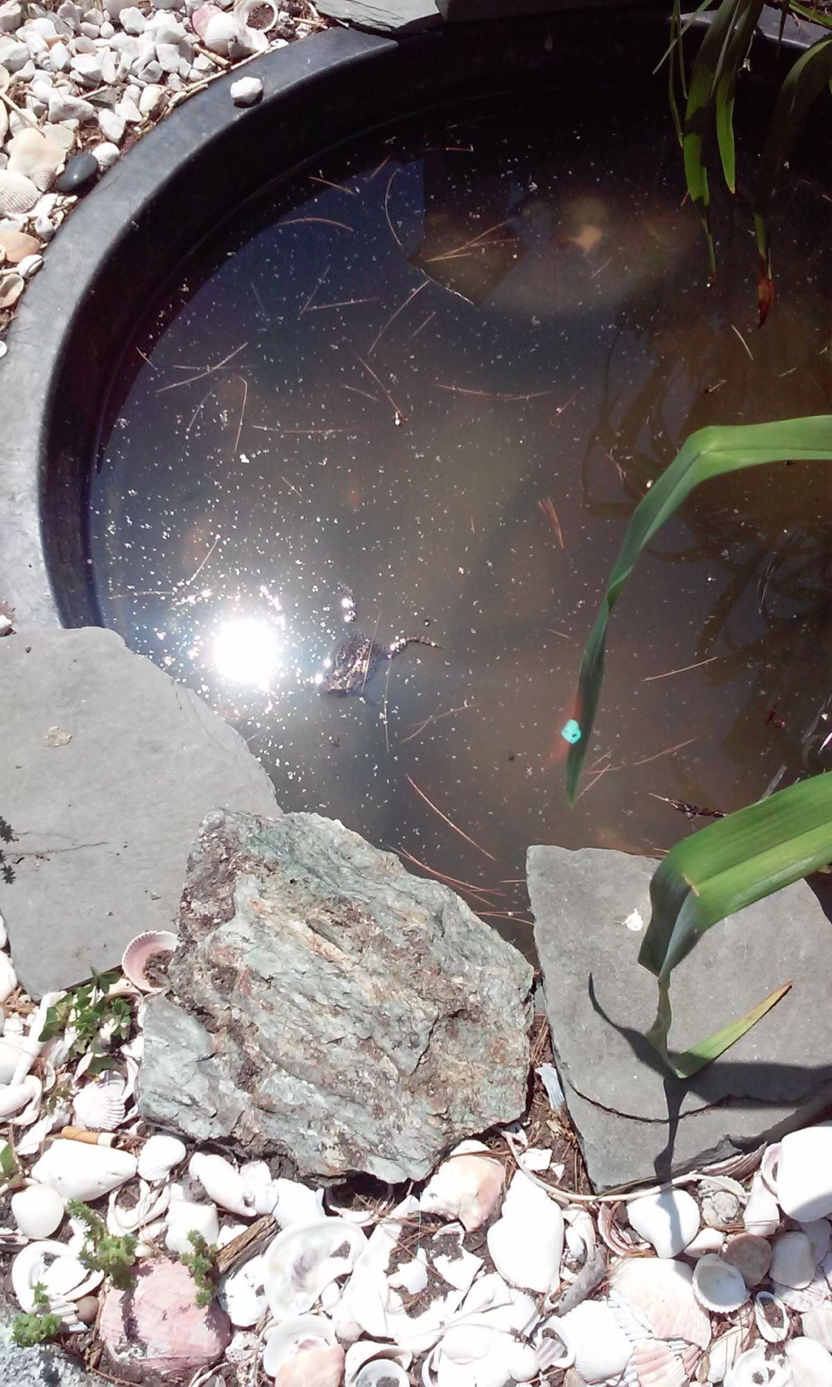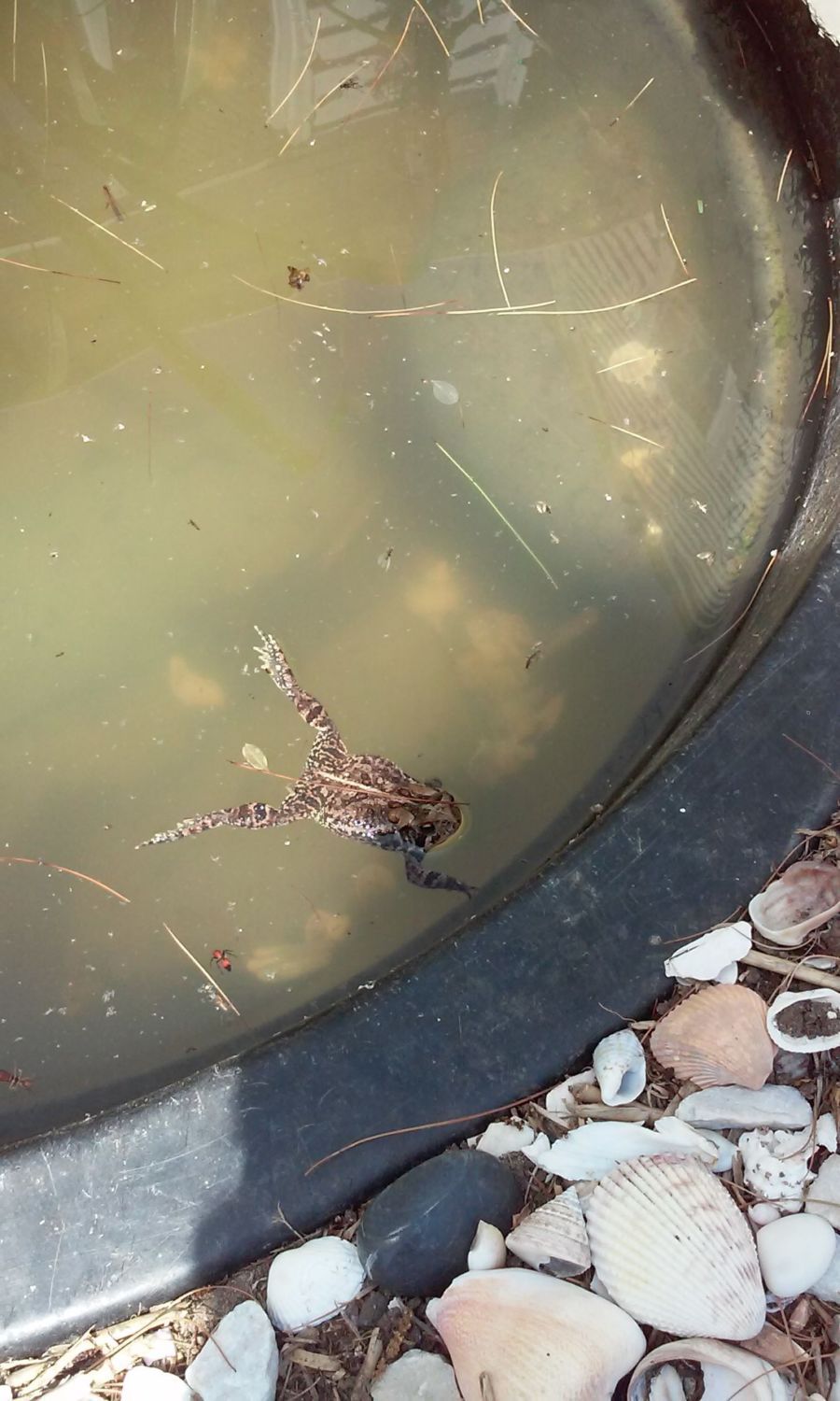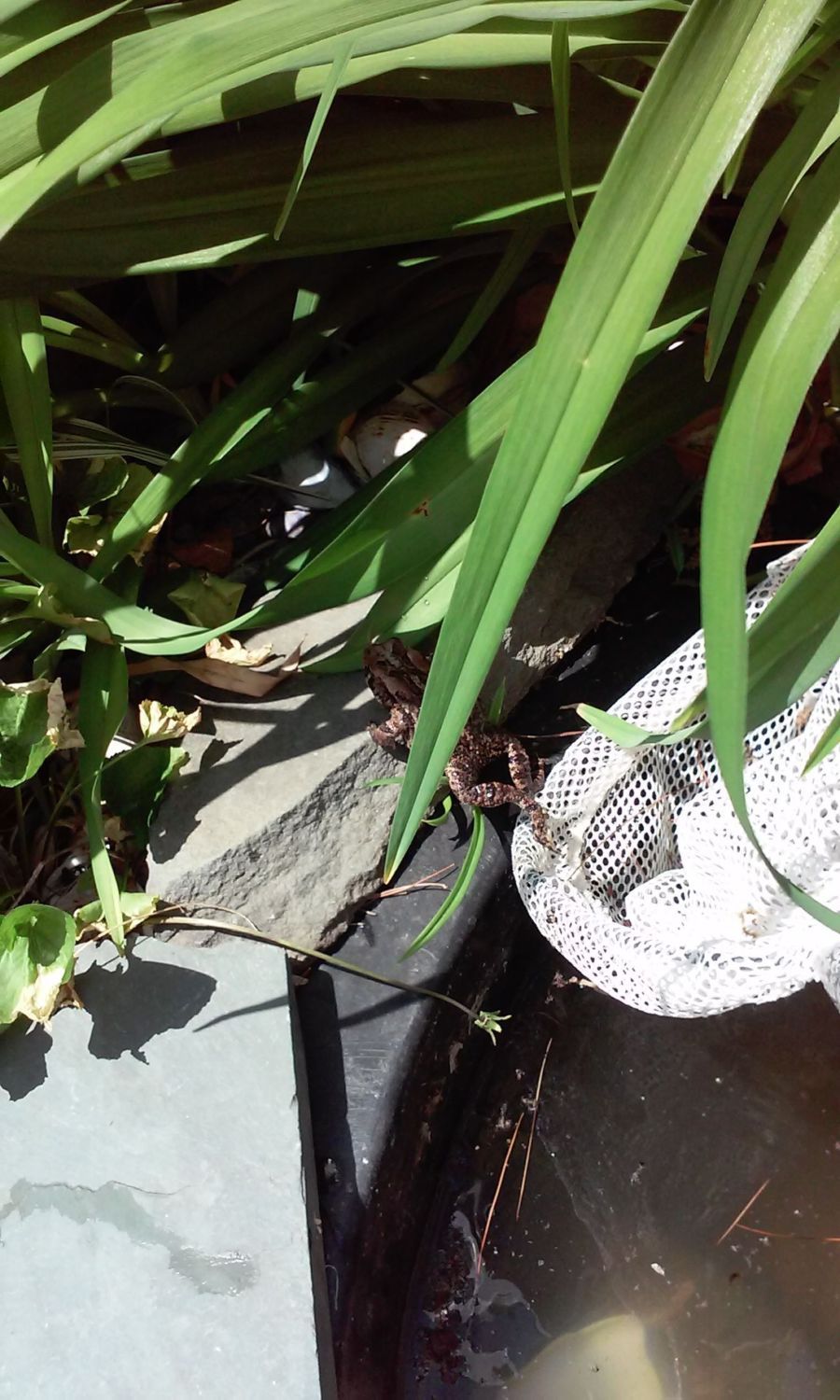 We get alot of those guys too. If you hadle them, you could get warts. It's not a myth, its the truth. I learned it the hard way. If you have em' use duct tape to get em off.Found this little guy in our garden pond today! Pretty sure it's a toad but no clue what species or anything. He also looked like he was having some trouble getting out and kept coming over and trying really hard to get out. Sooo... i helped him! And tried to build a little exit ramp! Lol the one shell floated too so that also works. And I didn't even need to fully net him, just kind of pushed and lifted so the pic with the net is really as far inside as he went so that was goodI think he appreciated it though and he's very docile. I left him alone after this though.![]()