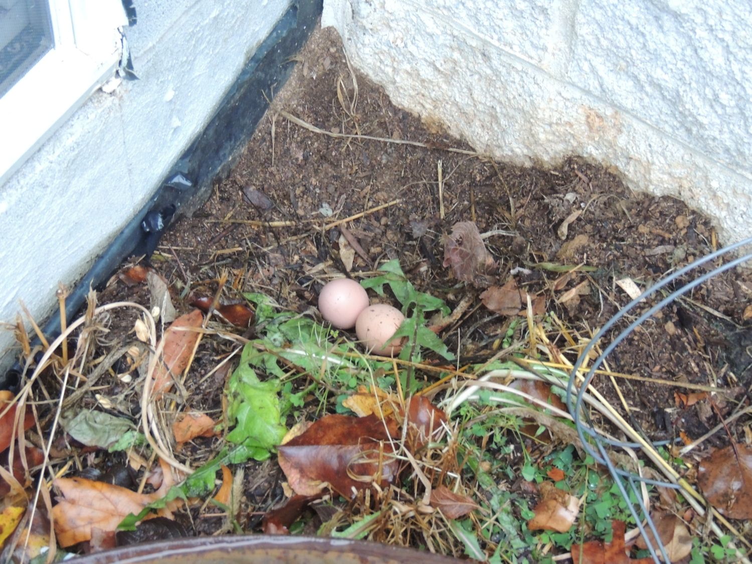 I heard a ruckus of cackling about a week ago, but found nothing when I went outside to the girls. Today I heard it again and went out and found TWO eggs along the foundation! IDK if just one girl laid them this morning, or if she laid one yesterday and one today.