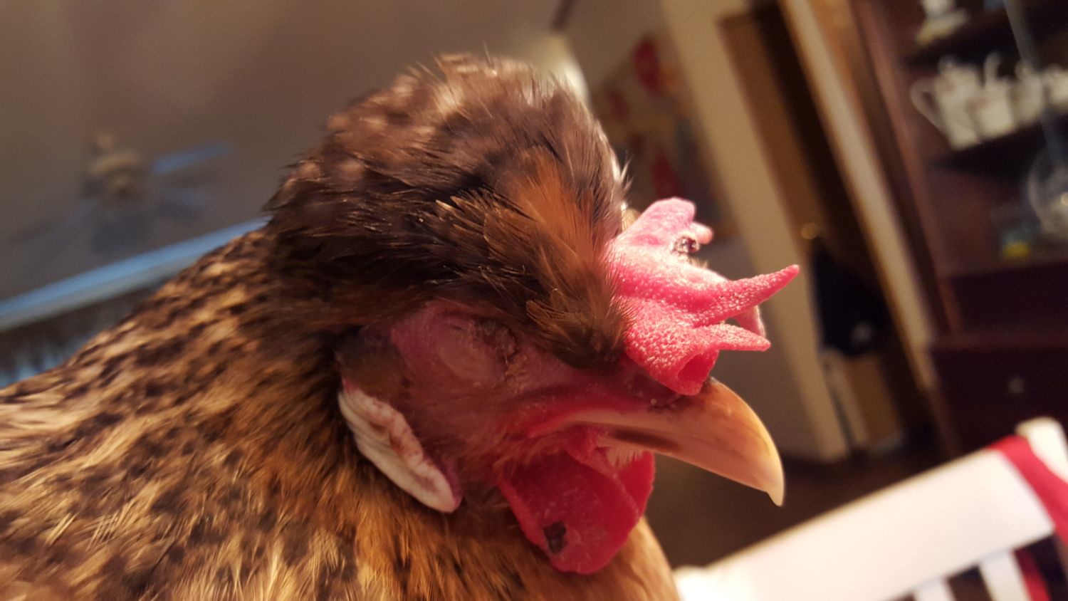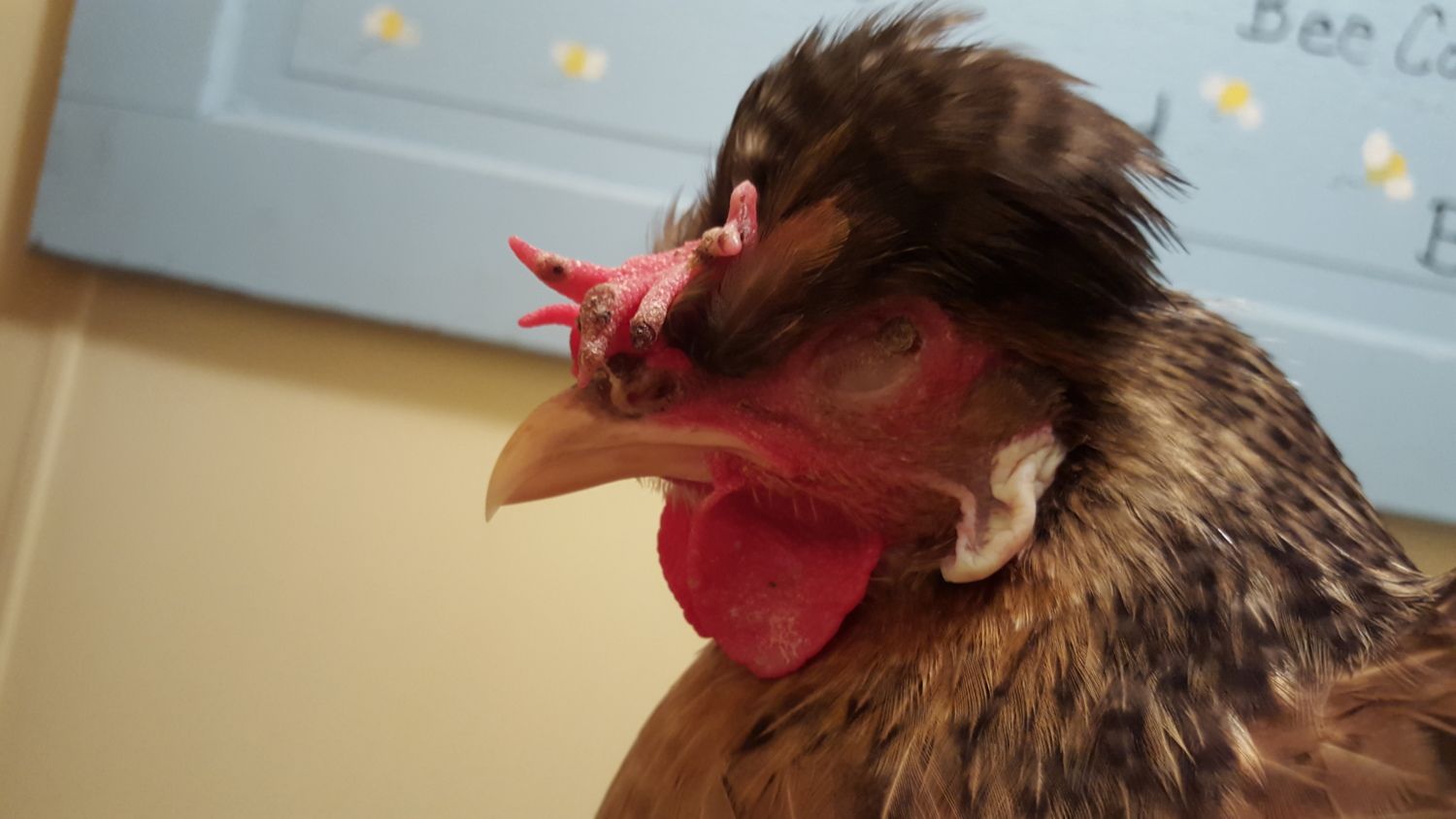 I have a nine month old Cream Legbar and I noticed that she has what appears to be a growth or scabbing on both of her eyes to a point where they are almost forced closed, they are also on her comb and wattle. Someone suggested fowl pox -- from my google image search that seems possible. I have her separated from the rest of the flock. What are my main concerns, can anyone give me any input?