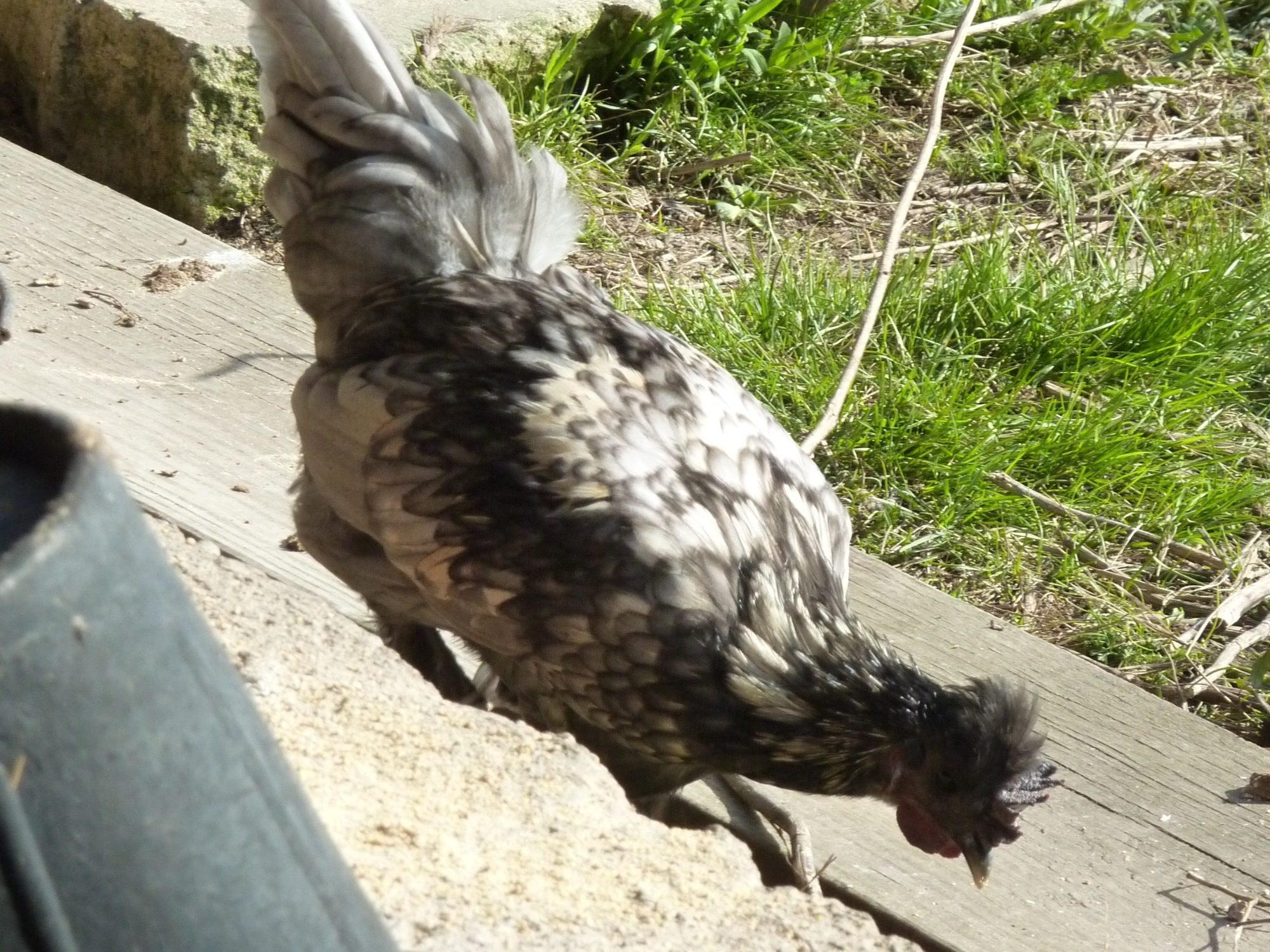 Ruby while she was broody. A late freeze made the water turn to ice, hints why she can stand on it. Only part of it was frozen though, so they could still drink. If you look close you can see how her wings are barely spread and her tail is lifted high while her head is hunched low. This is how broodies run around when hinting the roosters they are already sitting on eggs and not laying at the moment, so they don't need to be bred.
