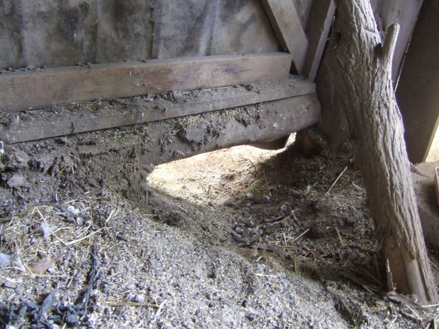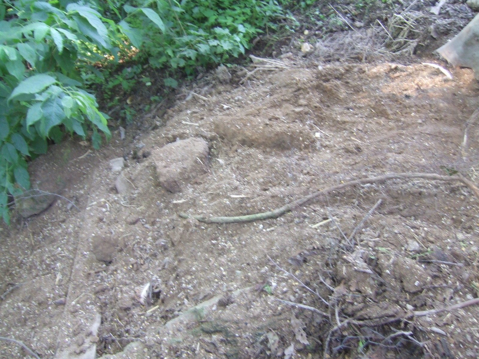 I could hardly "bear" opening the door to the roosting area to see what he had done to the chickens, but they were all sitting up on their roosts, apparently enjoying the spectacle - with the exception of one old Cochin hen that had run out into a corner of the run, where she had managed to avoid getting trampled underfoot. The bear had dragged the feeder out into the run where it was crushed and empty. But how had he gotten in, and why didn't he go back out the same way?