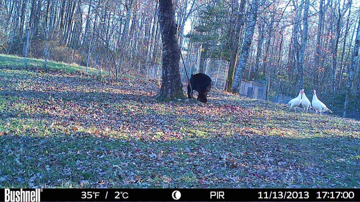 But at least here in the NC mountains, bears that have a taste for domestic poultry, are few and far between (as in one in 15 years for us). However, most bears in these parts are strongly attracted to poultry food. So if you are a poultry person in bear territory, then your first priority should be to keep your food supply protected - and separate from the poultry themselves.