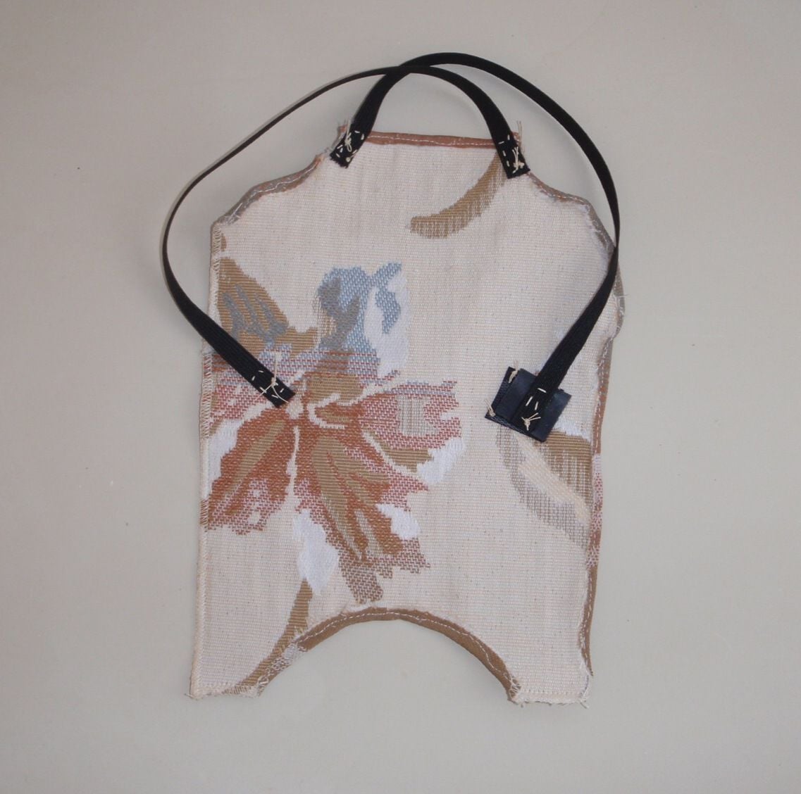 Because this hen is so docile, she was a perfect Test Chicken to make the trial run design because she just sat there for me. I used a piece of tissue paper laid on her back and a Sharpie to draw the shape and size for a pattern. The material is tapestry, like what you would upholster a chair cushion with. It is similar to canvas, and I saw posts that it needed to be stiff enough so that the tail area lays flat. It is still hot here so I didn't want to use fleece or anything heavier. It is double layered so I had to fold over the edges and stitch them and to keep from fraying (my first time using a sewing machine!). I put the material on her and fitted the elastic with pins. The elastic crosses on her chest and comes up under the wings. I offset the elastic from the edges where it comes under the wings so that the fabric covers her shoulders, which were also getting pecked. It didn't interfere with her flapping to get on the roost. It was difficult to get it off, so when I sewed on the elastic I made one of the sides a velcro closure (the black square) and it was easy to put on. The velcro is on the underside so they can't peck at it to get it open.